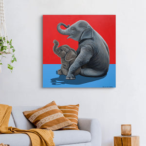 Description "Gentle Giant at Play" captures a heartwarming scene where a majestic grey elephant walks alongside a mini pink baby elephant against a vibrant and pop-colored background. The realistic painting style brings to life the playful interaction between the two elephants, with the gentle giant exuding a sense of care and protectiveness towards its smaller companion. Against the backdrop of lively and vivid hues, the duo's bond shines through, evoking a feeling of warmth and joy. Through its charming imagery and vibrant color palette, the artwork invites viewers to revel in the innocence and wonder of the gentle giants at play, reminding us of the beauty found in unexpected friendships and the simple pleasures of companionship.