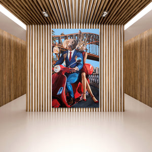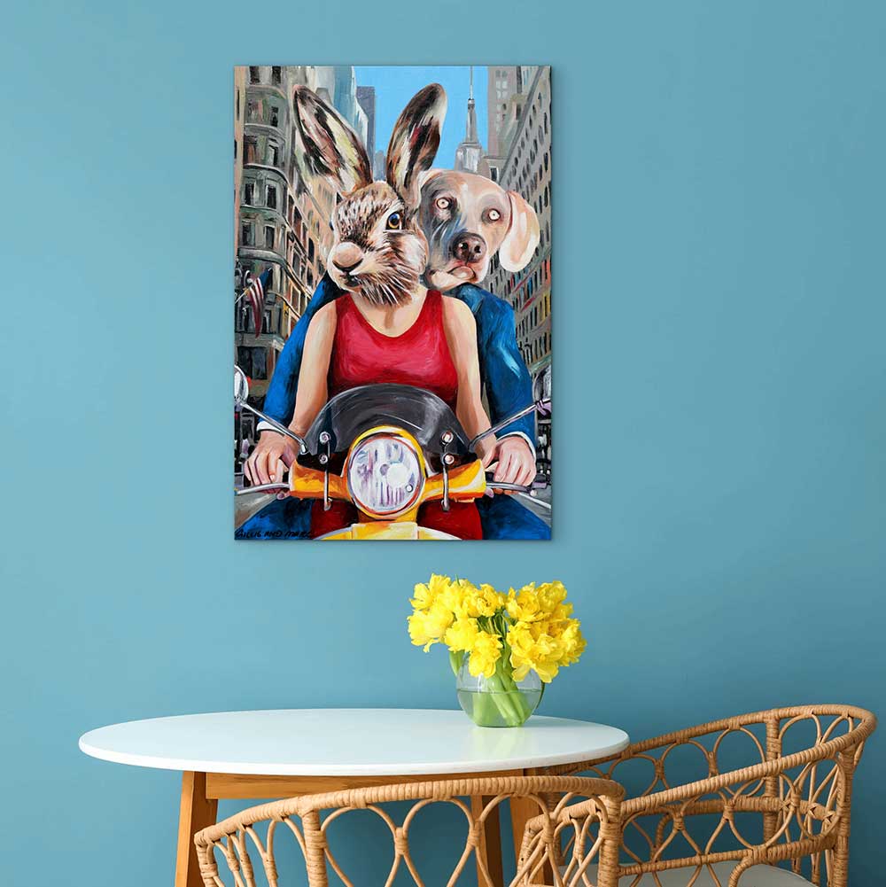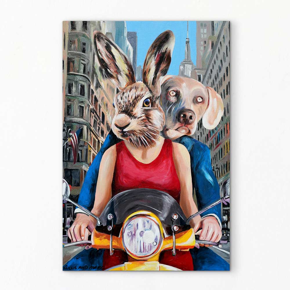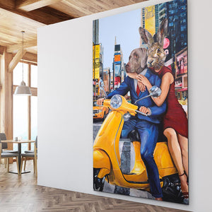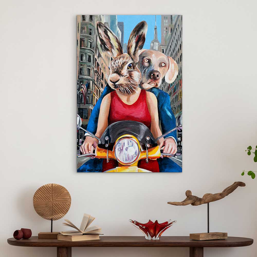 Description Here We Go Again captures Rabbitwoman and Dogman in one of their most iconic moments — riding through the bustling streets of New York on their yellow scooter. Surrounded by the city’s energy, the duo embodies freedom, love, and adventure. The expressive brushwork and dynamic composition bring the scene to life, symbolising the excitement of shared journeys and the joy of always finding new beginnings together.