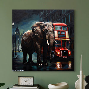 Description This artwork, "London Elephant" by Gillie and Marc, creates a striking contrast between the natural world and urban life. Set against the backdrop of London at night, the painting features a majestic elephant standing in front of a classic red double-decker bus. The wet streets reflect the city lights, adding depth and mood to the scene. The elephant’s presence in this metropolitan setting challenges the viewer to consider themes of displacement, coexistence, and the intersection of wildlife with modern civilization. Gillie and Marc frequently use animals in their art to promote conservation awareness, and this piece likely serves as a reminder of the beauty and importance of wildlife in an increasingly urbanized world. The elephant’s powerful yet serene stance makes it a focal point, evoking a sense of awe and reverence.