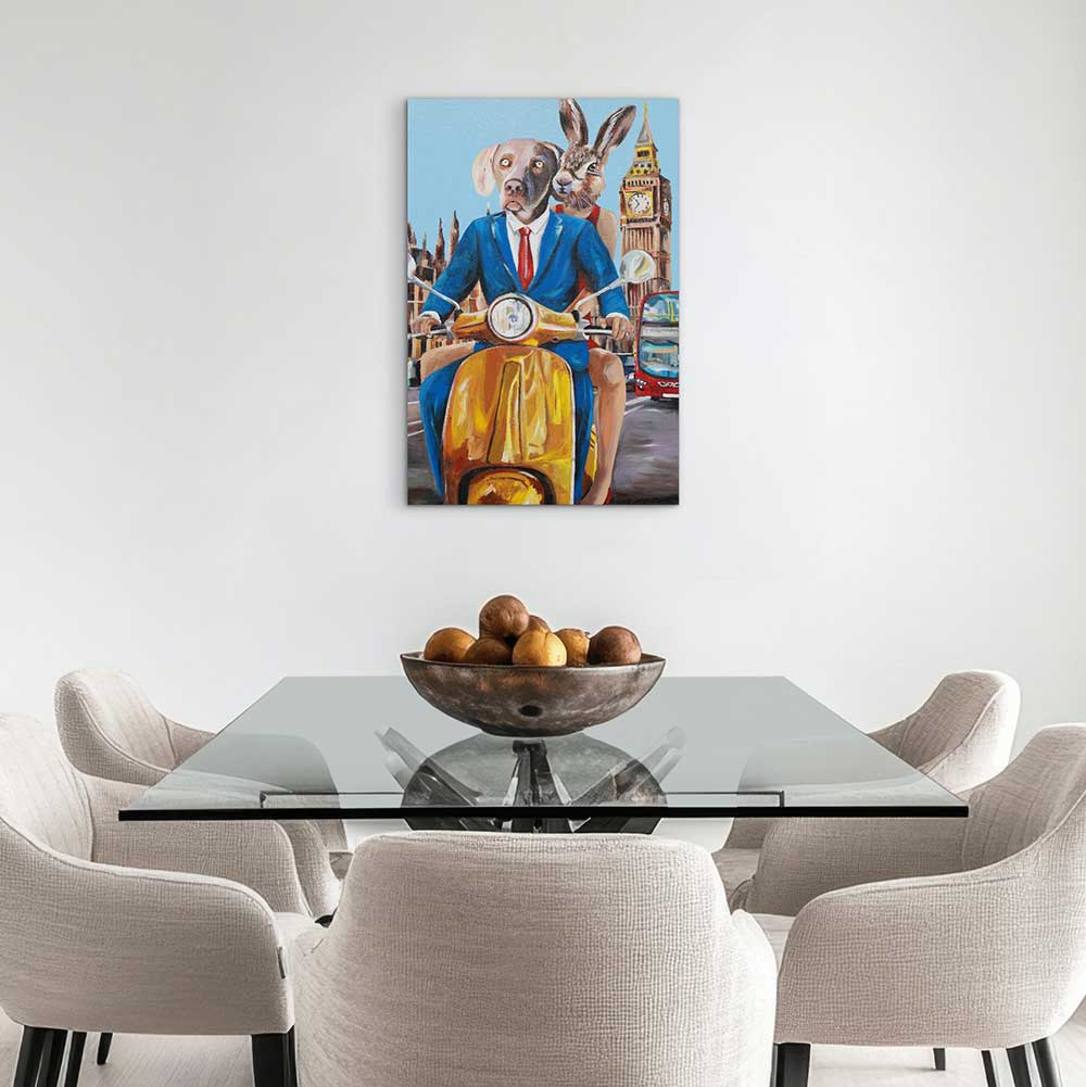 Description "London Vespa Lovers" captures the charm and adventure of rabbitwoman and dogman as they ride their Vespa through the bustling streets of London. With iconic cityscapes in the background, including the Gherkin and double-decker buses, this artwork vividly brings to life the energy and excitement of exploring one of the world's most vibrant cities. The contrasting attire of rabbitwoman, in a bright red top and floral skirt, and dogman, in a blue suit, symbolizes the blend of sophistication and whimsy. This piece celebrates the romance and joy of shared adventures, inviting viewers to join the characters on their delightful journey through London.