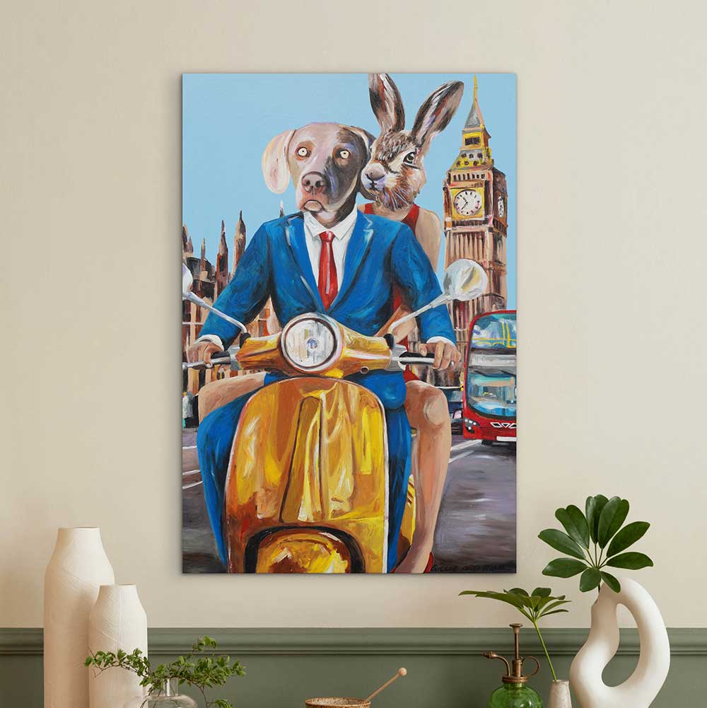 Description An energetic cityscape featuring Rabbitwoman and Dogman riding a gleaming yellow scooter through the streets of London. The iconic Big Ben tower and a classic red double-decker bus frame the background, while the duo’s vibrant clothing and expressive brushstrokes bring a lively sense of motion. Signed by the artists, this piece captures the thrill of adventure and the timeless romance of exploring one of the world’s great cities together.