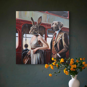 Description This striking painting captures a moment of sophistication and intrigue, featuring a rabbitwoman and dogman as elegantly dressed passengers aboard a red double-decker bus. The rabbitwoman, adorned in a flowing gown, and the dogman, sharply dressed in a suit, evoke an aura of class and mystery. The city’s bustling energy contrasts with the serene, poised expressions of the two figures as they stand in the moving bus, effortlessly blending the charm of the animal world with the high fashion of human society. The vibrant interior of the bus and the subtle play of light create a captivating scene that speaks to the endless journey of both travel and self-expression.