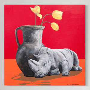 Description In the endearing painting "Rhinos Love Tulips," a small grey rhinoceros leans against a grey vase containing yellow tulips, seemingly drifting off to sleep. The scene exudes a sense of tenderness as the rhinoceros finds solace and comfort in the presence of the vibrant tulips. Against a textured backdrop of solid red and orange hues, the simplicity of the setting enhances the focus on the gentle interaction between the rhinoceros and the tulips. Despite the contrasting colors, the scene emits a warmth and tranquility, capturing the quiet beauty of nature's harmony. This charming composition celebrates the unexpected bond between the sturdy rhinoceros and the delicate tulips, highlighting the inherent connection and appreciation for the natural world.