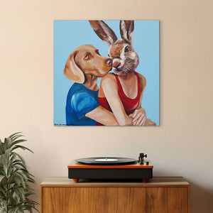 Description A tender portrait of everlasting love. Rabbitwoman and Dogman share a quiet embrace against a clear blue background, their figures rendered in warm, expressive brushstrokes. Dogman leans in with a gentle kiss as Rabbitwoman turns slightly, eyes soft with affection. The simple composition highlights their deep connection, celebrating devotion and the comfort of true companionship. Signed by the artists, this piece captures an intimate moment of pure, timeless love.