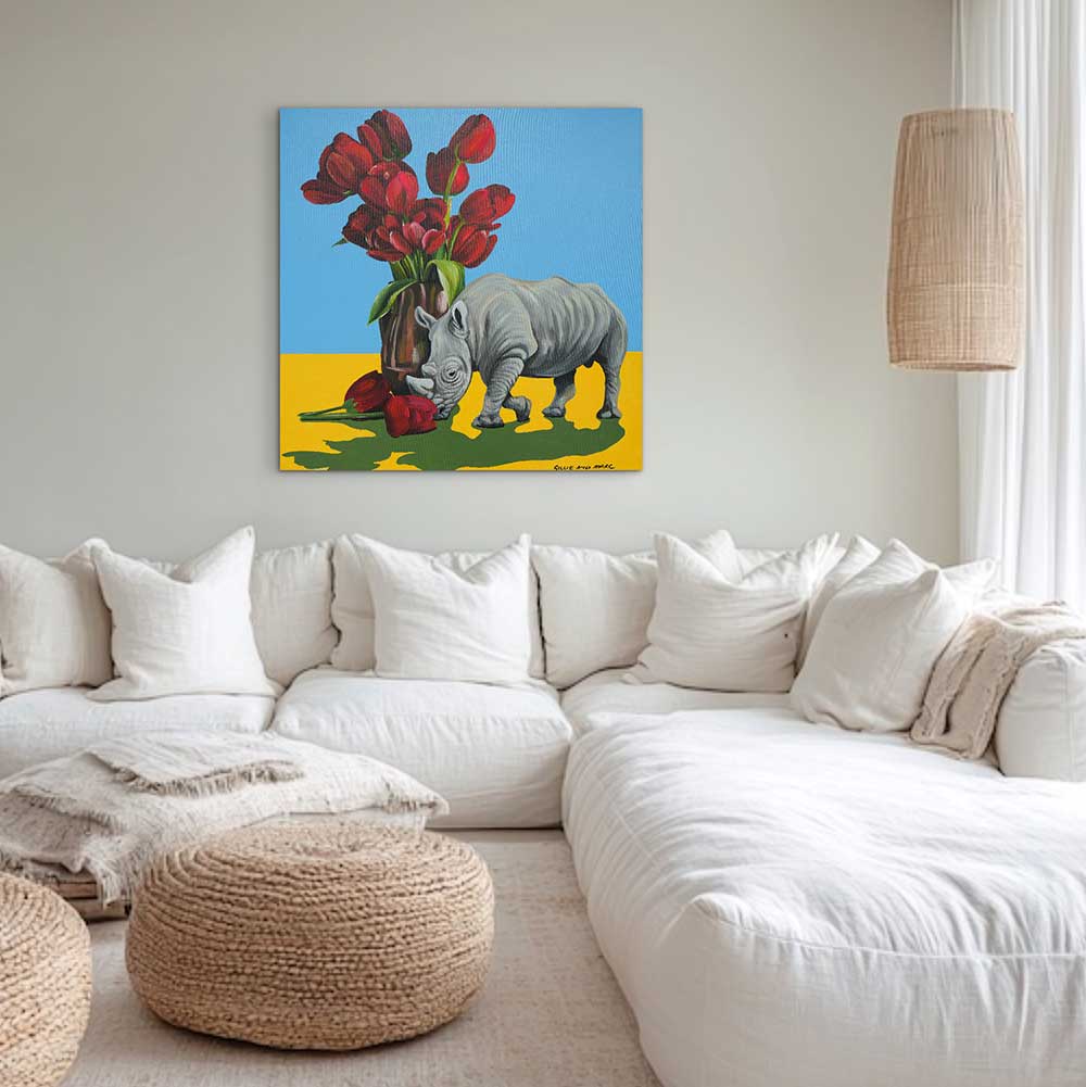 Description A quiet, tender moment—this little rhino isn’t charging or posing, just pausing to sniff the fallen tulips like they’re a secret message. The bold, clean blocks of blue and yellow feel almost like a stage, making the grey rhino and deep red blooms stand out with real emotional weight. The vase sits tall and glossy, but it’s the dropped flowers and the rhino’s lowered head that change the mood: gentle, curious, and a little bit bittersweet—like something beautiful happened here, and you can still feel it.