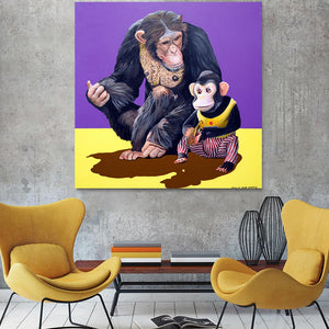 Description This original painting depicts a large, endangered chimpanzee alongside his beloved toy - a smaller version of himself. The title, 'Chimp Love', serves as an homage to the strong emotional bonds experienced by primates in the wild as they care for one another.