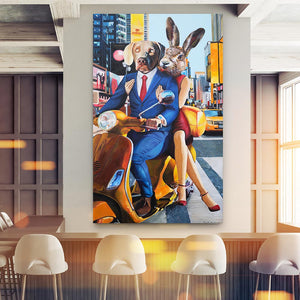 Description In this painting, Dogman and Rabbitwoman are seen zipping through the bustling streets of New York City on their bold yellow Vespa. As the vibrant colors of the city pass them by, their infectious joy is palpable. The artwork captures the dynamic energy of the city that never sleeps as they weave through traffic, skyscrapers towering above them. With their fur fluttering in the wind and smiles lighting up their faces, they epitomize the vivacity and thrill of urban exploration. This painting serves as a reminder of the unyielding spirit of adventure and the sheer exhilaration found in the heart of one of the world's most amazing cities.