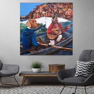 Style Contemporary Realism Description Dogman and Rabbitwoman have always cherished the freedom and romance of the ocean. For them, there is no greater feeling than the salty breeze of the open sea, the serenity of the waves, and the endless depths of the horizon. With music as their trusted companion, the pair can spend evenings serenading each other and expressing their love through song. It's a place where they find themselves wholly alone together, lost in their own thoughts and the sound of each other. For them, the ocean is the ultimate symbol of undying love and everlasting freedom, and it's where they find themselves time and time again, exploring the edges of the world and discovering the beauty of nature at its most elemental. Whether nestled against the coast or forging ahead into open waters, there is no terrain or roadblock they can't surmount with the power of their love and their passion for music. Artwork Features The iconic style of Gillie and Marc’s Thick Texture Paintings provide the tangible dimensions of a sculpture with the convenient spatial simplicity of a painting. Multiple layers of impasto are mixed with the paint. With each piece, Gillie and Marc are sharing a part of their unique experience through choppy brushstrokes and captivating visuals that create a harmonious image that is more than just a painting.