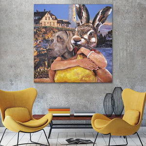 Description The artwork "What Goes Up Must Stay Up" by Gillie and Marc features their iconic characters, Rabbitwoman and Dogman, conveying a unique story.Dressed in an elegant red dress, Rabbitwoman stands beside Dogman, who is clad in a sophisticated blue suit. Together, they hold a large red balloon, which serves as a central focal point. The balloon may symbolize dreams, hope, or love, aligning with the title's message—"What goes up must stay up." This could represent the idea of holding onto something precious in life, maintaining aspirations, or the effort required to sustain something valuable. Rabbitwoman and Dogman are known to symbolize love and companionship beyond differences, making them powerful visual storytellers. The artwork blends soft yet striking colors with detailed realism, creating a whimsical and surreal atmosphere. It invites viewers to interpret its meaning based on their own emotions and experiences.