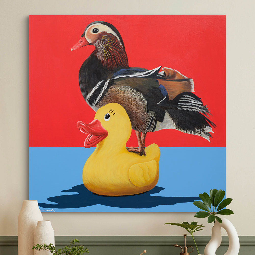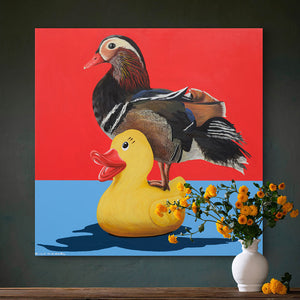 The painting features a highly detailed and realistically rendered Mandarin duck standing atop a bright yellow rubber duck. The contrast between the lifelike bird and the cartoonish, plastic toy creates a humorous yet thought-provoking juxtaposition. The bold red and blue background adds a pop-art feel, making the composition even more eye-catching. Gillie and Marc often use surreal and whimsical elements in their work to encourage reflection on deeper themes. This piece could symbolize the intersection of nature and human-made objects, questioning how we perceive authenticity versus artificiality. It also playfully highlights the idea of "fitting in"—a real duck standing on an imitation of itself, perhaps a metaphor for identity and belonging.