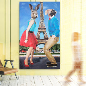 This captivating painting portrays Rabbitwoman and Dogman in an exuberant dance, set against the backdrop of the bustling streets of Paris. Their graceful movements and the joy evident on their faces evoke a sense of liberation and celebration. This painting symbolizes the freedom found in expressing oneself through movement and embraces the spirit of embracing the present moment. It embodies the beauty of unity and harmony, as Rabbitwoman and Dogman's different natures and characteristics come together to create a captivating dance. The setting in Paris adds an element of romance and enchantment, enhancing the sense of whimsy and adventure. Ultimately, this painting serves as a reminder to find joy in the simple pleasures of life, to let go of inhibitions, and to embrace the beauty of connecting with others through shared experiences.