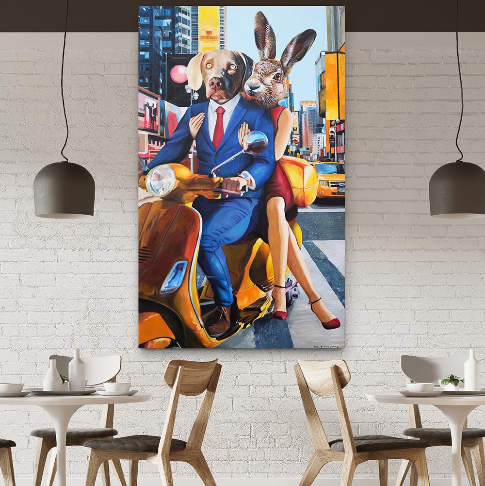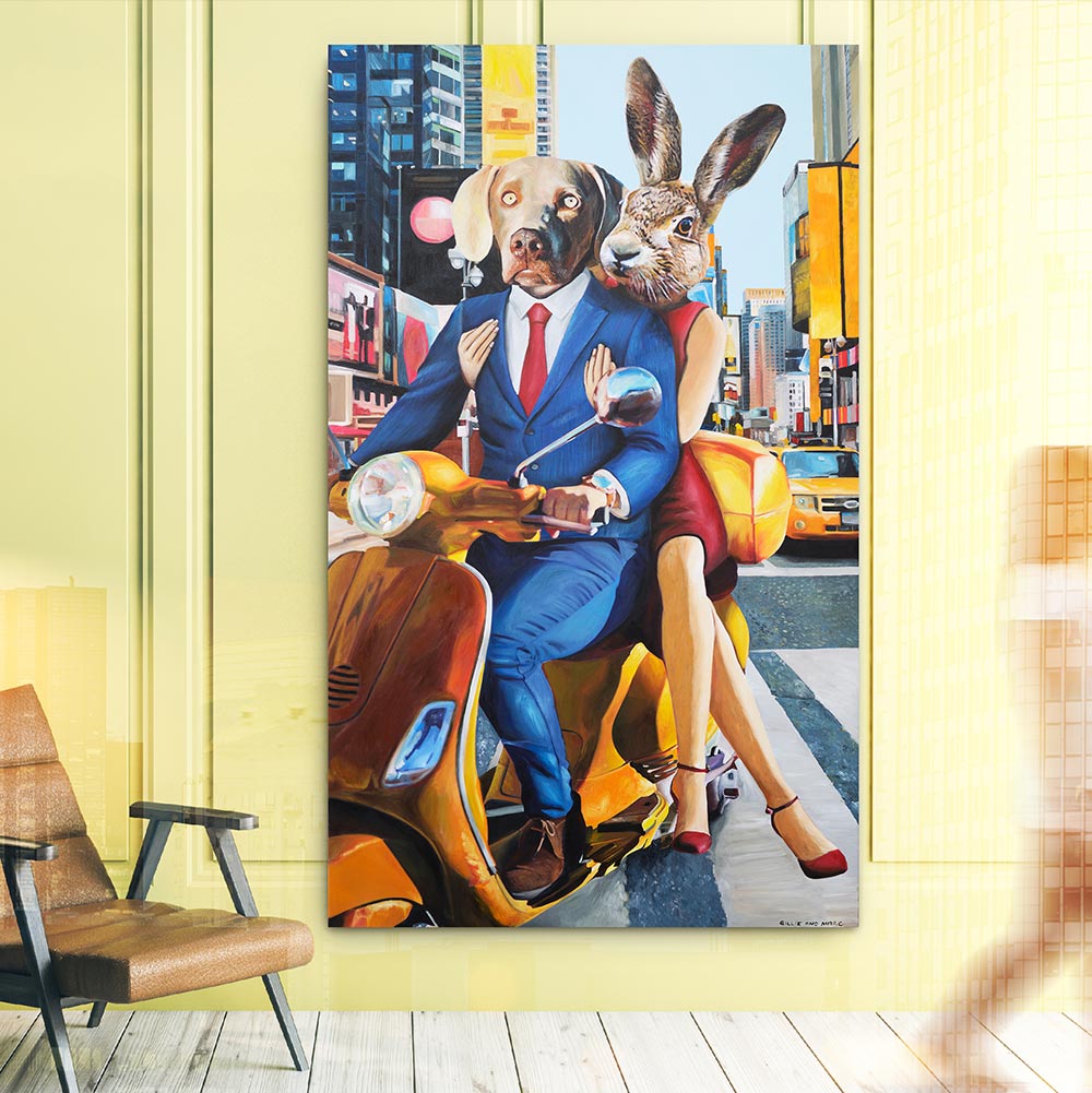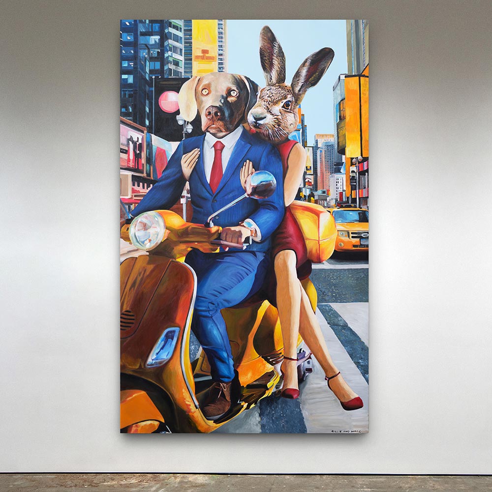 In this painting, Dogman and Rabbitwoman are seen zipping through the bustling streets of New York City on their bold yellow Vespa. As the vibrant colors of the city pass them by, their infectious joy is palpable. The artwork captures the dynamic energy of the city that never sleeps as they weave through traffic, skyscrapers towering above them. With their fur fluttering in the wind and smiles lighting up their faces, they epitomize the vivacity and thrill of urban exploration. This painting serves as a reminder of the unyielding spirit of adventure and the sheer exhilaration found in the heart of one of the world's most amazing cities.