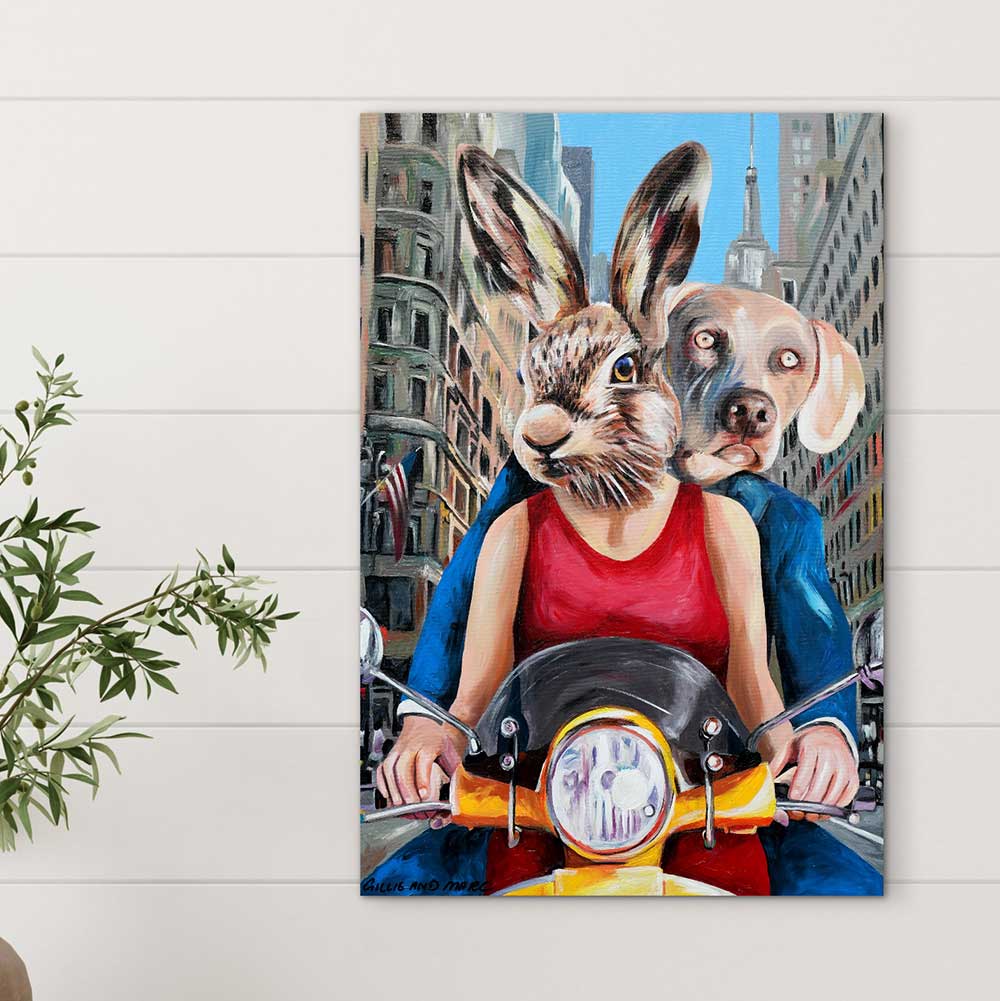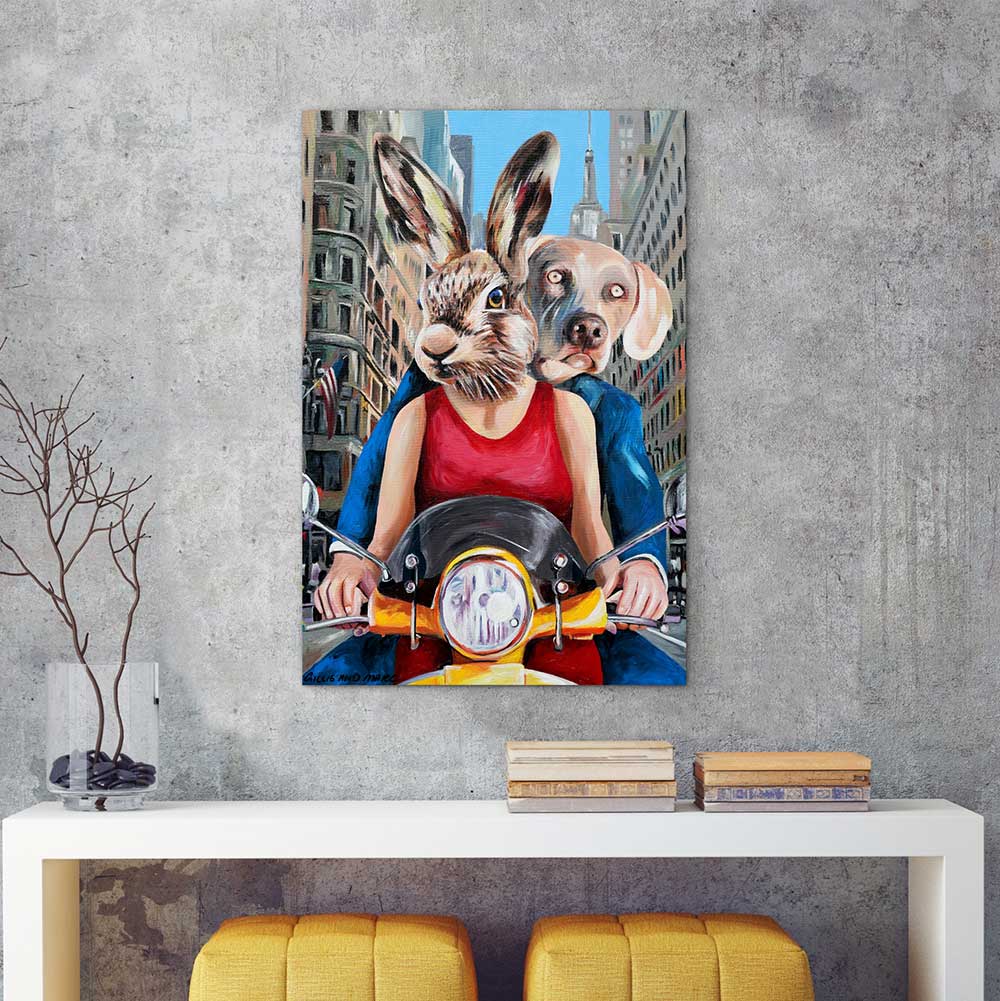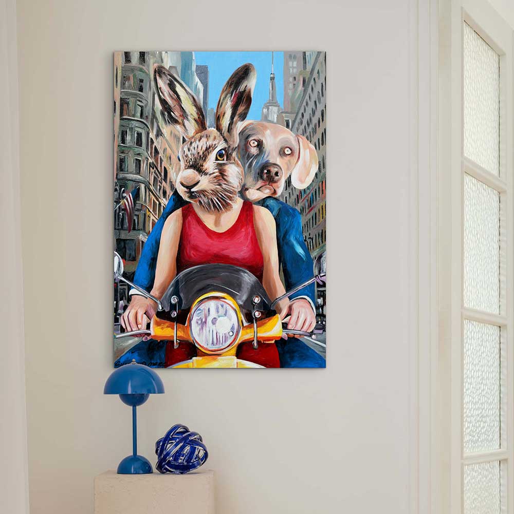 Here We Go Again captures Rabbitwoman and Dogman in one of their most iconic moments — riding through the bustling streets of New York on their yellow scooter. Surrounded by the city’s energy, the duo embodies freedom, love, and adventure. The expressive brushwork and dynamic composition bring the scene to life, symbolising the excitement of shared journeys and the joy of always finding new beginnings together.