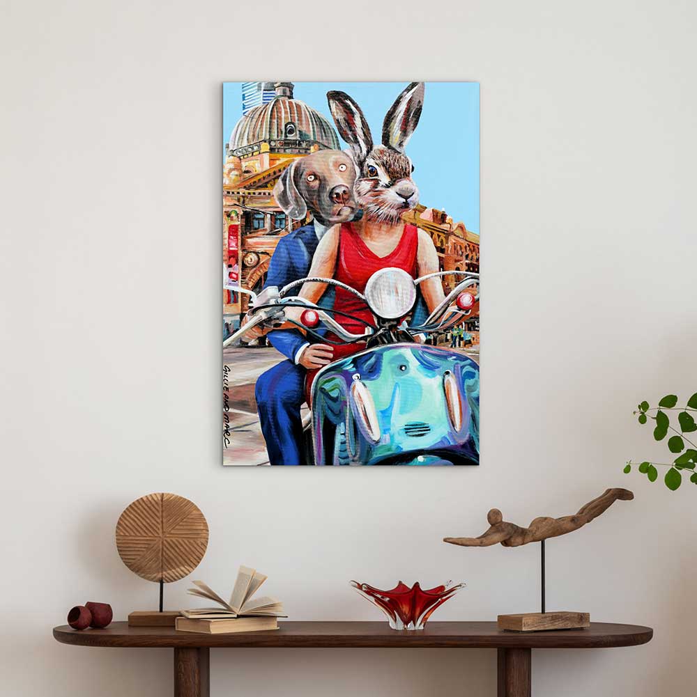Melbourne Is My Town celebrates Rabbitwoman and Dogman’s love story set against the vibrant backdrop of Flinders Street Station. The painting captures the charm and energy of the city, where history, culture, and romance intertwine. With expressive brushwork and radiant colour, the duo’s scooter ride becomes a symbol of exploration, freedom, and connection — a heartfelt tribute to finding love and belonging in the places we call home.