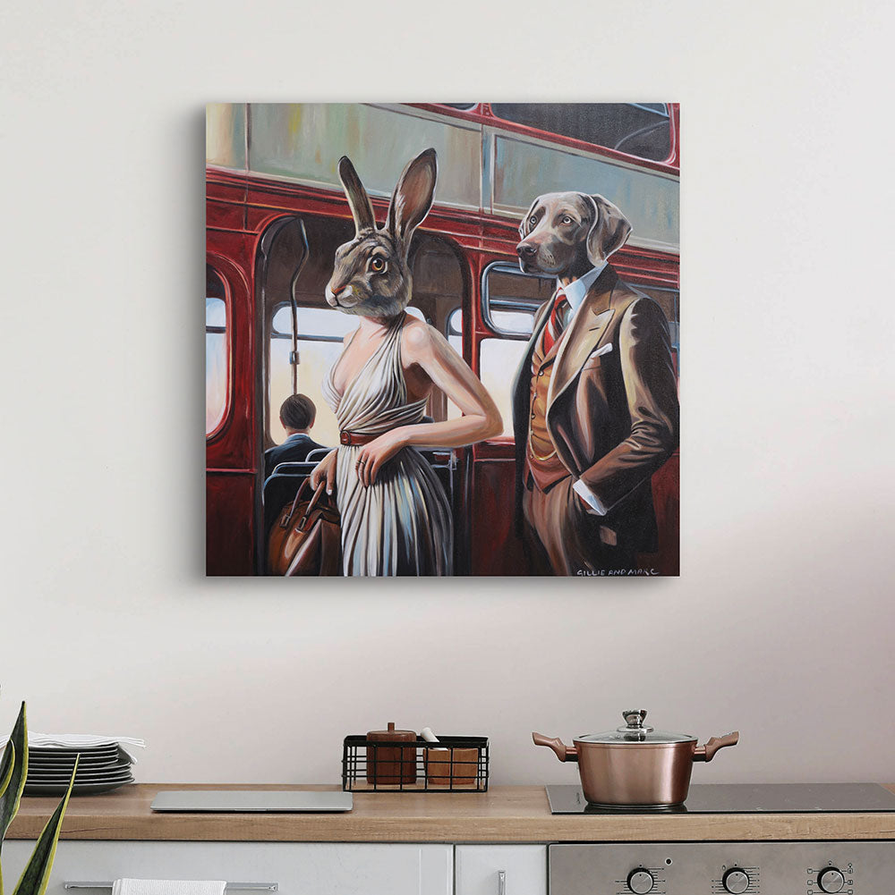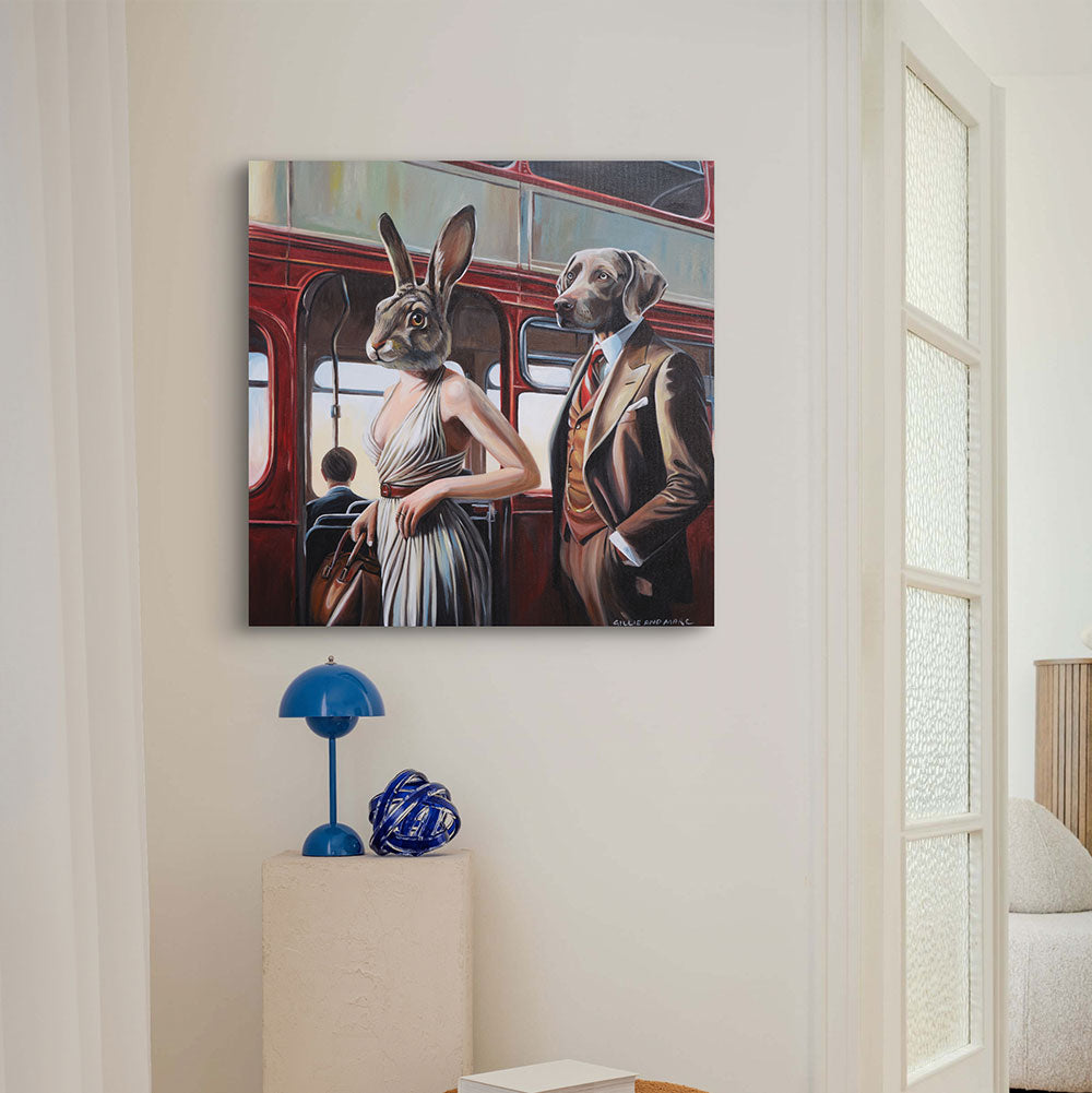 This striking painting captures a moment of sophistication and intrigue, featuring a rabbitwoman and dogman as elegantly dressed passengers aboard a red double-decker bus. The rabbitwoman, adorned in a flowing gown, and the dogman, sharply dressed in a suit, evoke an aura of class and mystery. The city’s bustling energy contrasts with the serene, poised expressions of the two figures as they stand in the moving bus, effortlessly blending the charm of the animal world with the high fashion of human society. The vibrant interior of the bus and the subtle play of light create a captivating scene that speaks to the endless journey of both travel and self-expression.