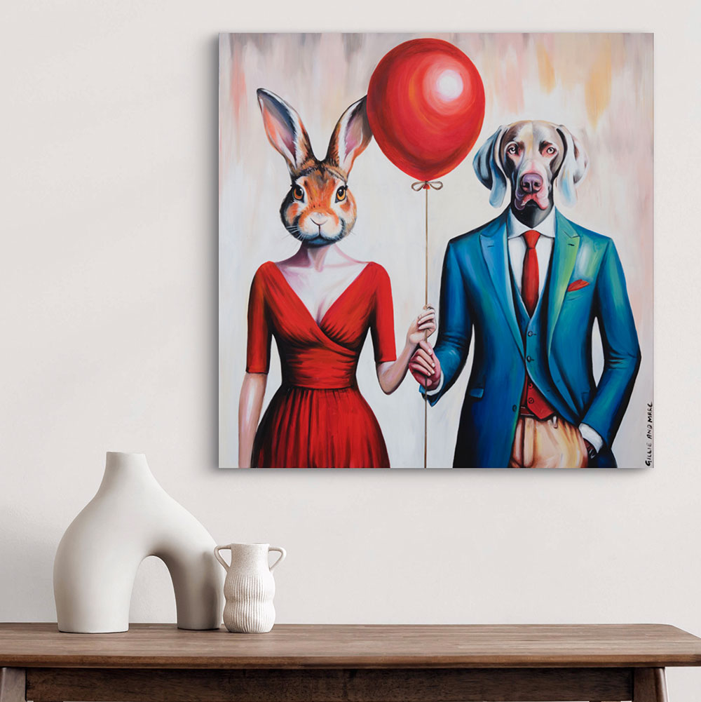 Red Balloon, Lovers Forever depicts Rabbitwoman and Dogman standing side by side, holding a single red balloon that symbolizes enduring love and commitment. Dressed elegantly—Rabbitwoman in a vibrant red dress that complements the balloon, and Dogman in a stylish blue suit with a red tie—the couple exudes a sense of timeless sophistication. The simplicity of their posture, holding hands and united by the balloon, highlights the purity and constancy of their bond. The soft, neutral background allows the bold colors of their attire and the balloon to stand out, emphasizing love as the central theme. This artwork captures the essence of a love that is dignified, steadfast, and forever intertwined.
