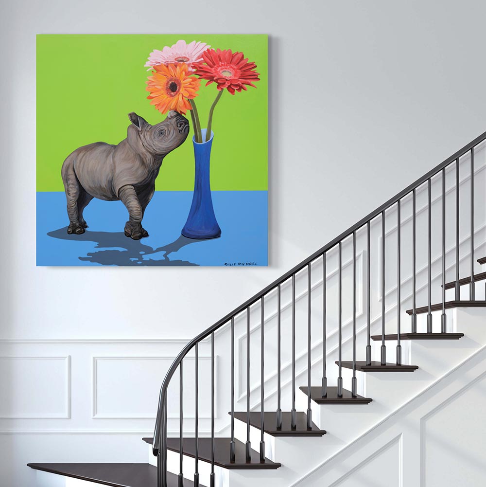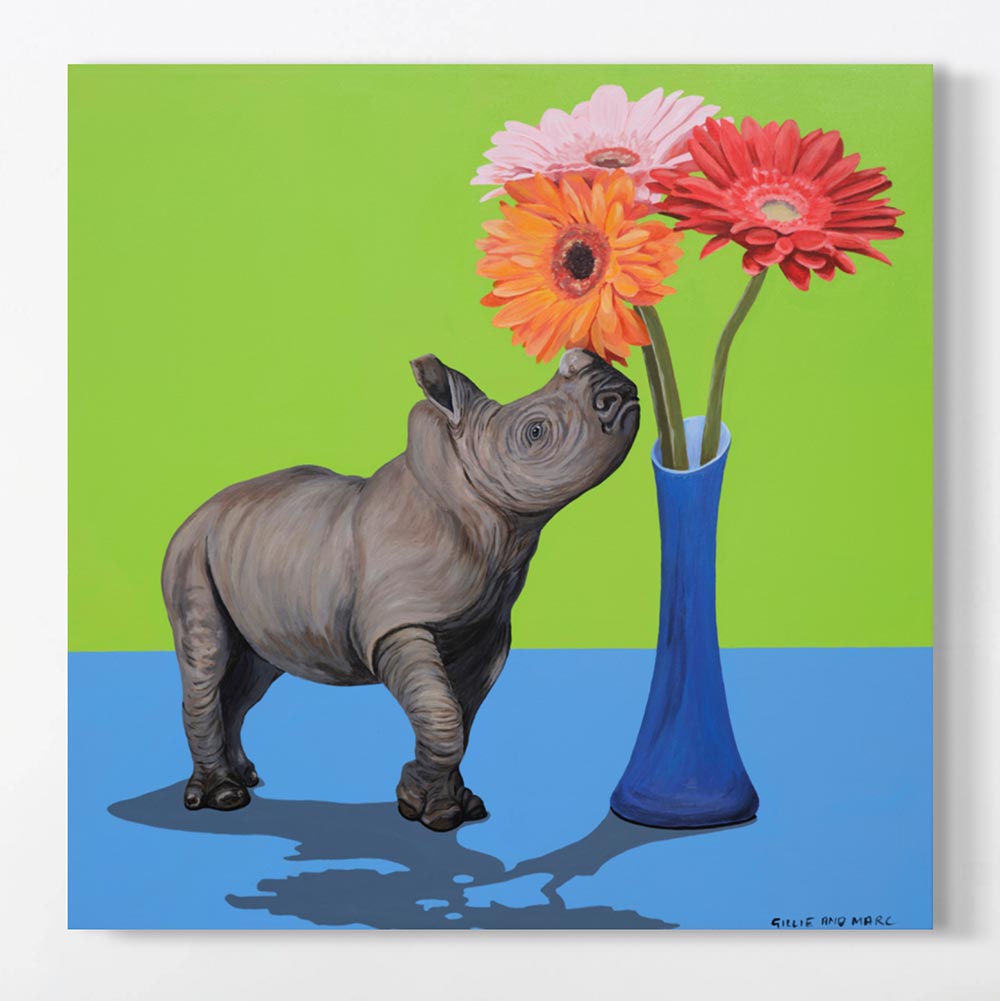 In the charming painting titled "Rhino and Flowers," a young rhinoceros is depicted curiously sniffing a vibrant bouquet of flowers in a blue vase. The background features bold blocks of color, with a bright green upper half and a vivid blue lower half, creating a striking contrast that highlights the central figures. The rhino, with its textured gray skin and innocent expression, stands with gentle curiosity, drawn to the colorful blooms of pink, orange, and red. The delicate flowers and the sturdy rhino create a captivating juxtaposition, symbolizing the harmony between strength and beauty. This delightful artwork captures a moment of pure curiosity and wonder, inviting viewers to appreciate the simple and unexpected interactions in nature.