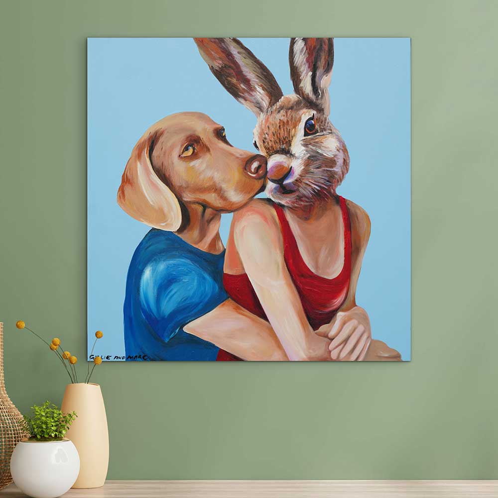A tender portrait of everlasting love. Rabbitwoman and Dogman share a quiet embrace against a clear blue background, their figures rendered in warm, expressive brushstrokes. Dogman leans in with a gentle kiss as Rabbitwoman turns slightly, eyes soft with affection. The simple composition highlights their deep connection, celebrating devotion and the comfort of true companionship. Signed by the artists, this piece captures an intimate moment of pure, timeless love.