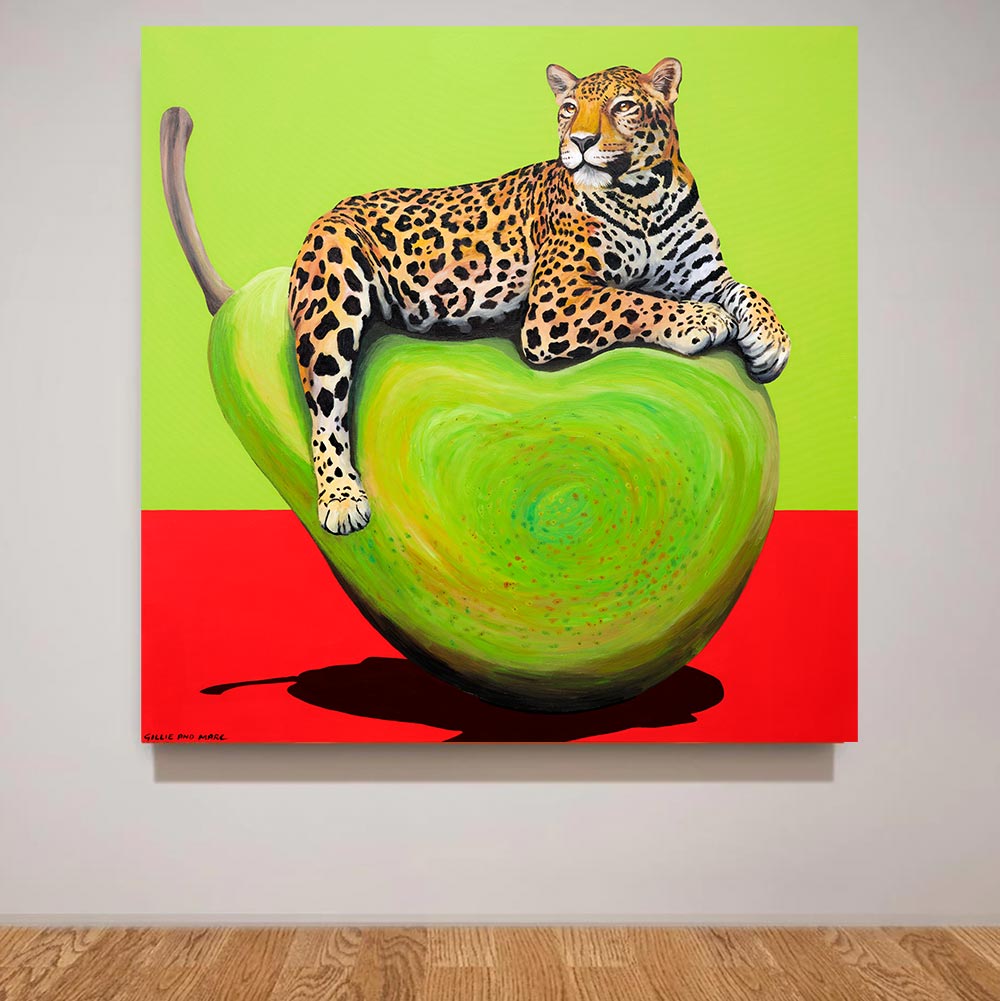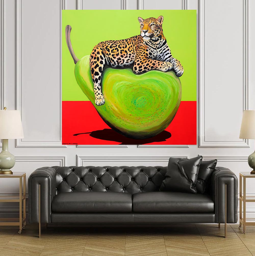 This original painting, entitled "The Leopard and Pear," artfully captures the power of nature and the importance of conservation. The majestic leopard, an endangered species, reclines atop an enormous pear, illustrating the intertwined destinies of animals and humanity.