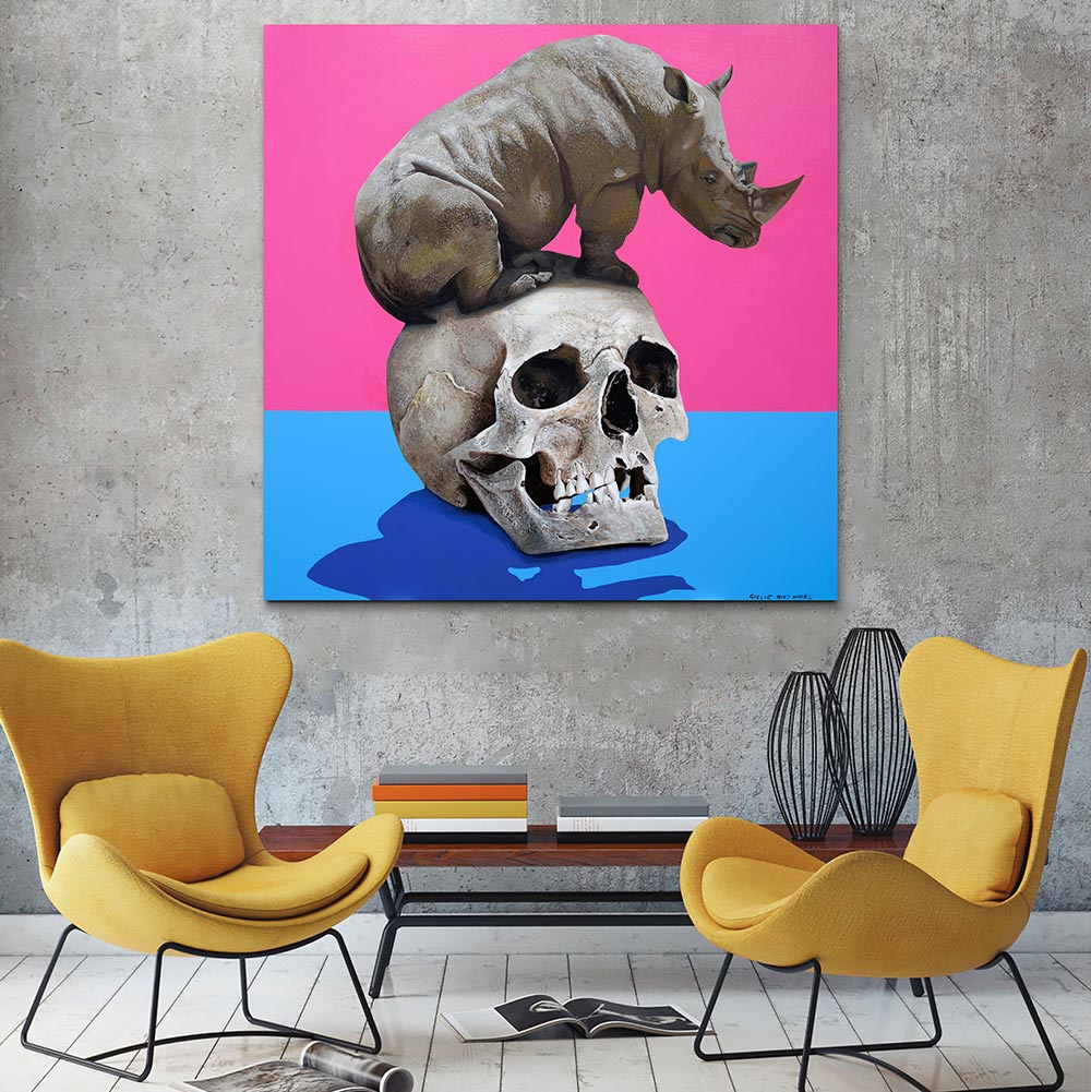 "The Rhino's Final Stand" is a poignant painting that captures the endangered rhino sitting atop an oversized skull, creating a powerful and symbolic image. The juxtaposition of the rhino, a majestic and resilient creature, with the skull, a symbol of mortality and death, conveys a profound message about the precarious state of these magnificent animals. The painting serves as a stark reminder of the urgent need to protect and preserve rhinos, as they face the threat of extinction. It represents the rhino's unwavering determination to survive, making its last stand against the forces that endanger its existence. This artwork calls upon viewers to take action and rally together to ensure the survival of these magnificent creatures and the preservation of our natural world.