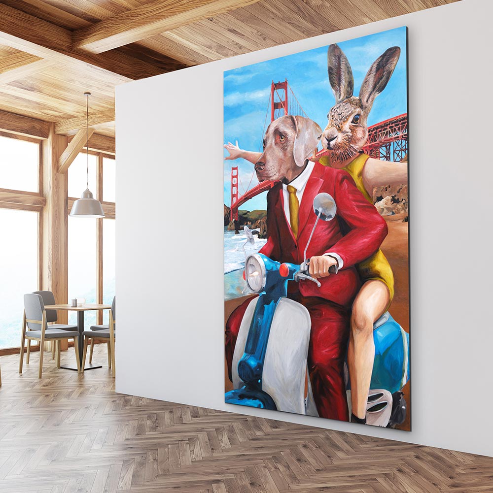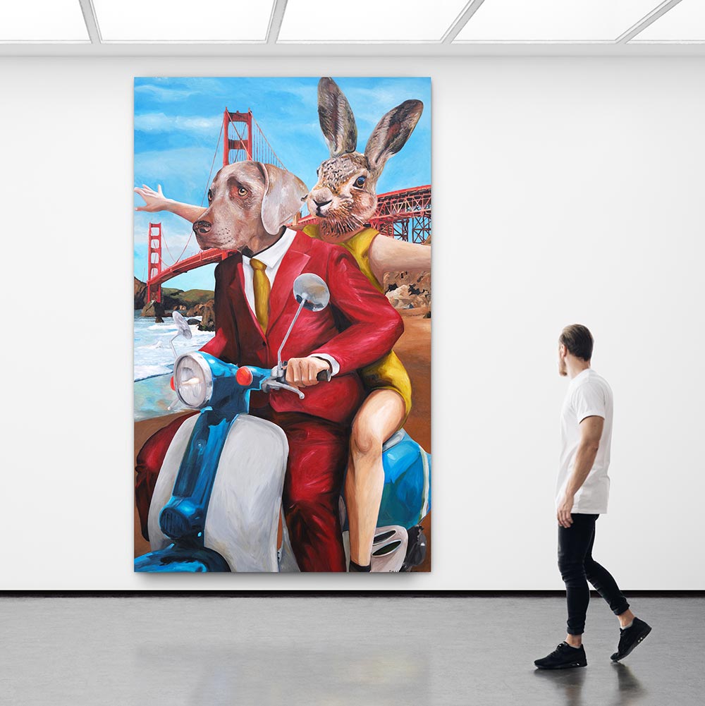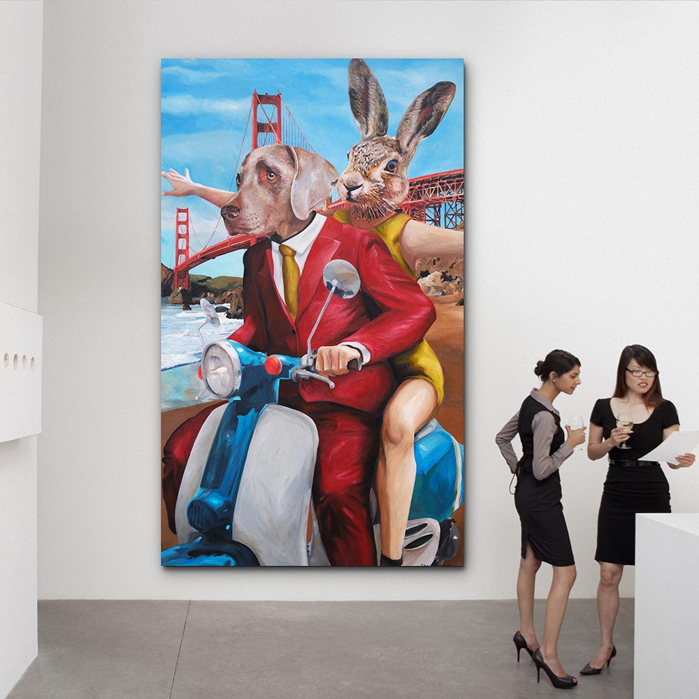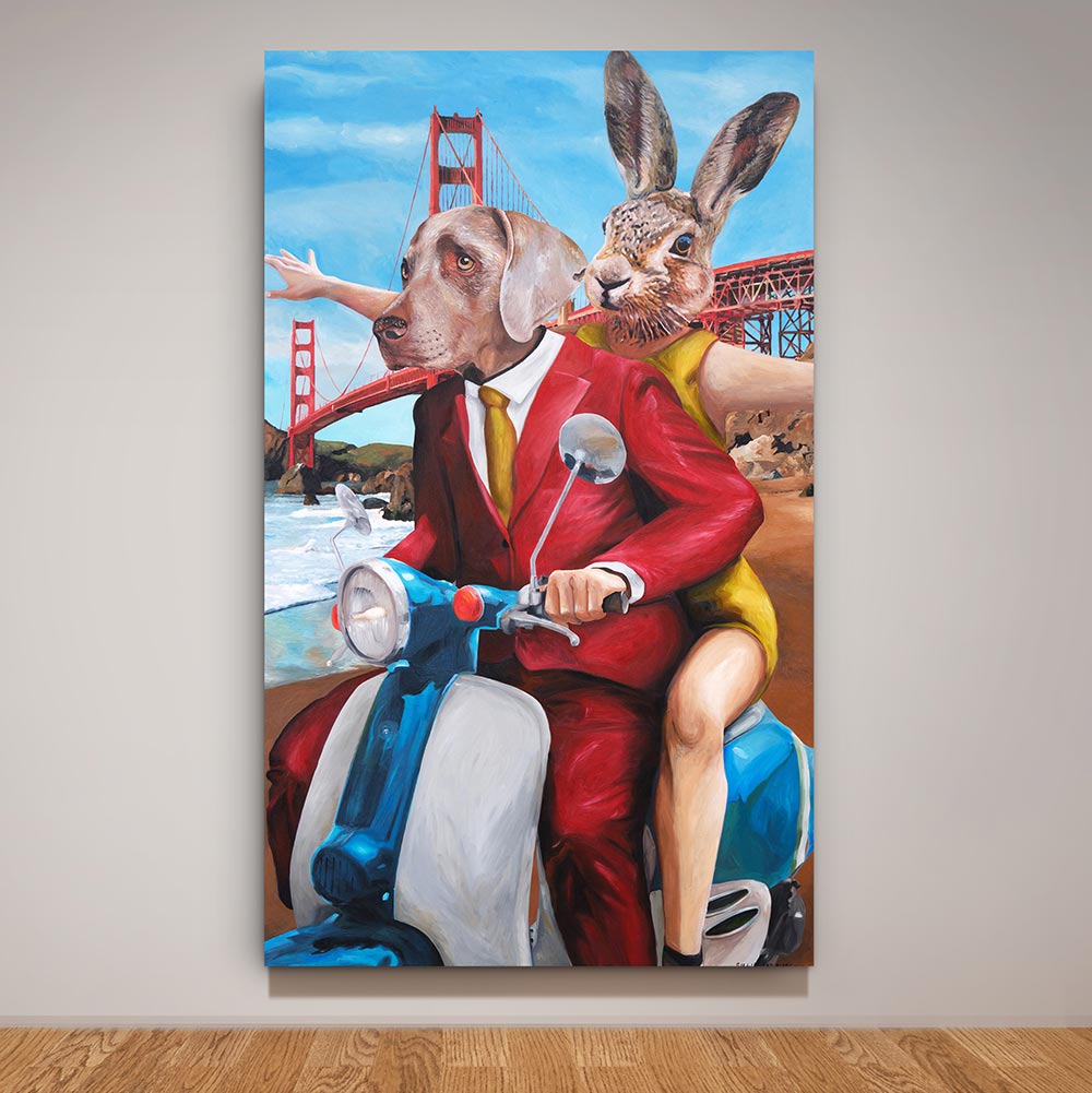 Rabbitwoman and Dogman were on a quest to discover the world, and San Francisco was their latest stop. They explored the city's beautiful streets and emerald hills, but it was the towering Golden Gate Bridge that intrigued them the most. They couldn't resist the urge to drive across it on their vespa, and as they crossed each steel strut, their excitement grew. They were living life to the fullest, and nothing could stop them from having a good time and making memories that would last a lifetime.