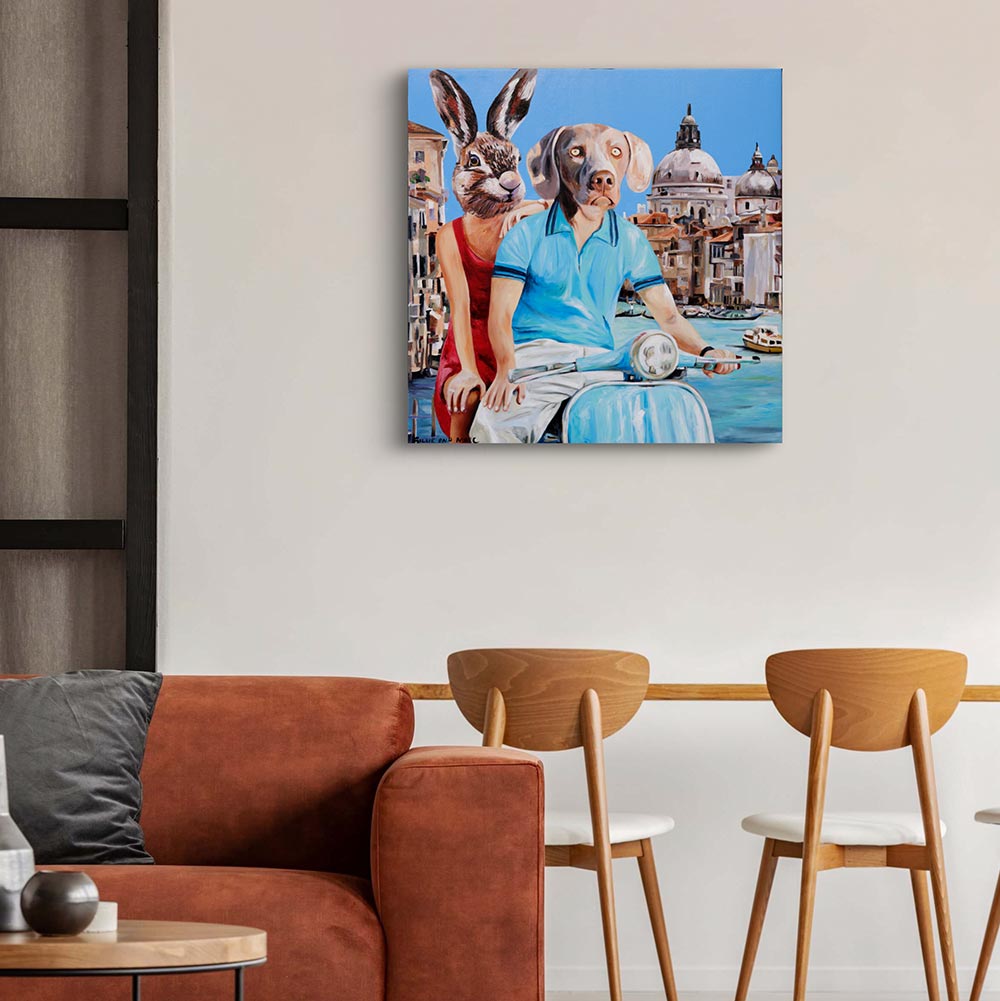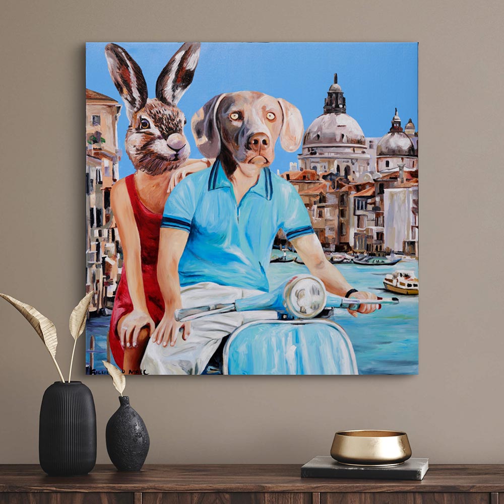 This intriguing artwork, titled "On a Jet Plane," vividly captures the essence of luxury and sophistication through an imaginative, anthropomorphic style. The unique portrayal of rabbitwoman and dogman in elegant attire, preparing to board a private jet, symbolizes the allure, elegance, and high-class lifestyle associated with air travel. The vibrant colors and meticulous details highlight the sophistication and exclusivity of the scene, evoking a sense of adventure and opulence. Each brushstroke adds depth and character, bringing the anthropomorphic figures to life in a way that is both captivating and whimsical. "On a Jet Plane" serves as a playful reminder of the allure of travel and the dream of experiencing life’s luxuries with grace and style.