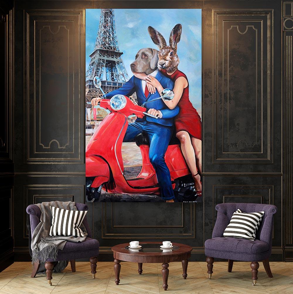 This artwork unveils an enchanting scene where Rabbitwoman and Dogman are seen riding on a vibrant red vespa, with the iconic Eiffel Tower gracefully towering over them in the background. This whimsical composition represents the magic of unexpected connections and serendipitous encounters that can happen amidst the bustling streets of Paris. The combination of the unconventional characters and their choice of mode of transportation adds a playful tone, evoking a sense of lightheartedness and adventure. The painting symbolizes the universal nature of love and friendship, transcending boundaries of species and embodying the quirky and daring spirit often attributed to the city of Paris. It encourages viewers to embrace the beauty in chance encounters and appreciate the wonderment found in unexpected relationships.