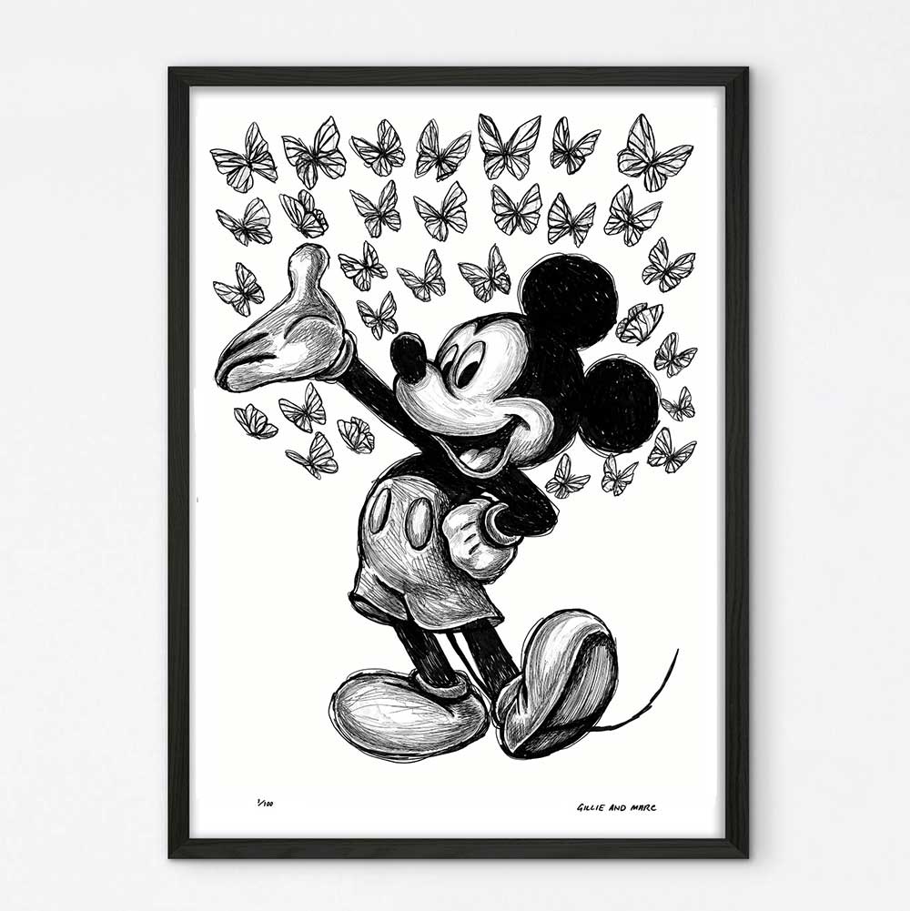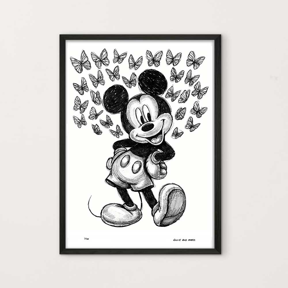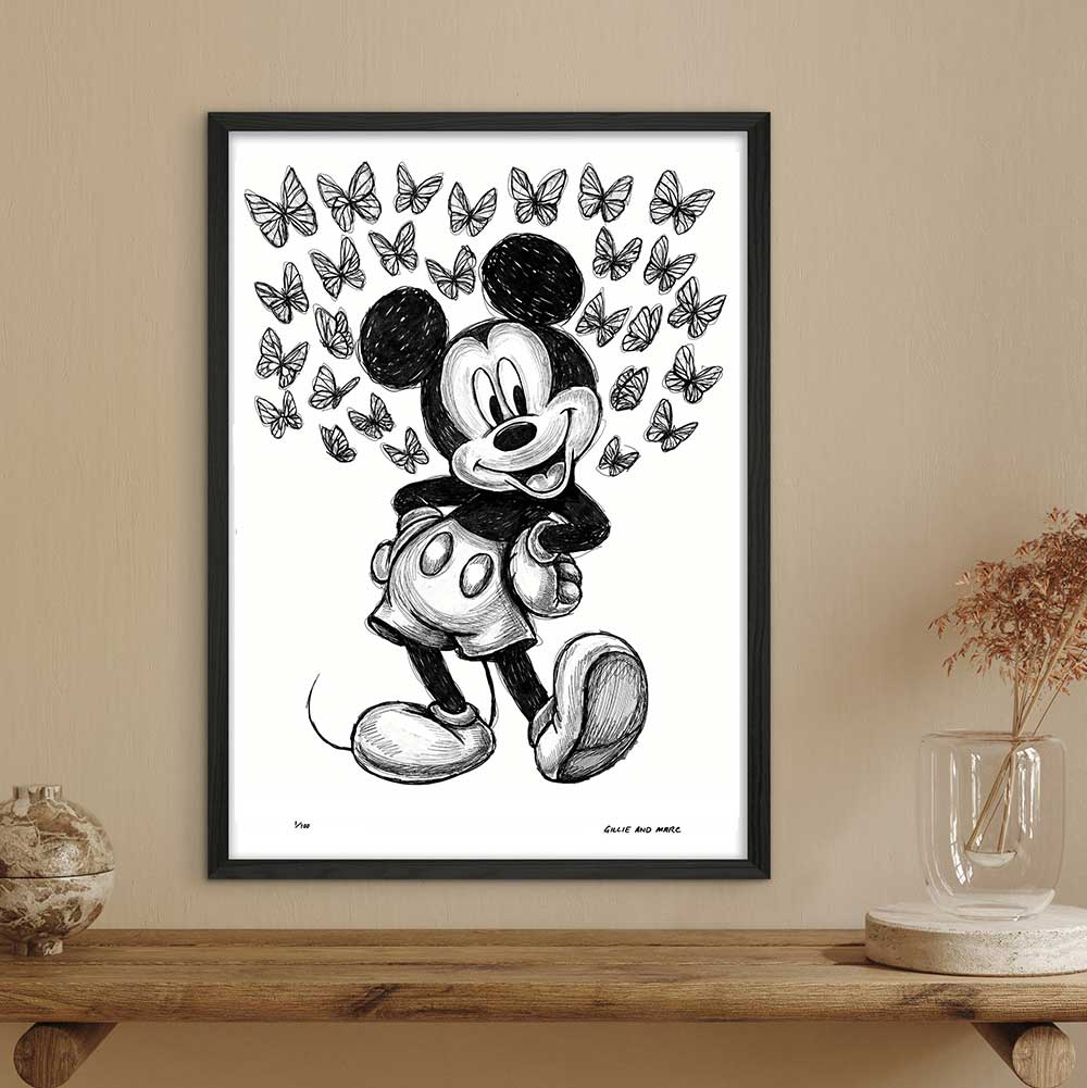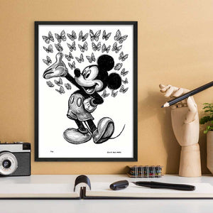 This charming illustration captures Mickey in a joyful, confident pose as a flutter of butterflies surrounds him. His playful stance and warm smile radiate positivity, bringing to life the timeless spirit that has made him an icon for generations. The expressive black-and-white sketch style adds movement and texture, giving the piece an energetic, hand-drawn feel.