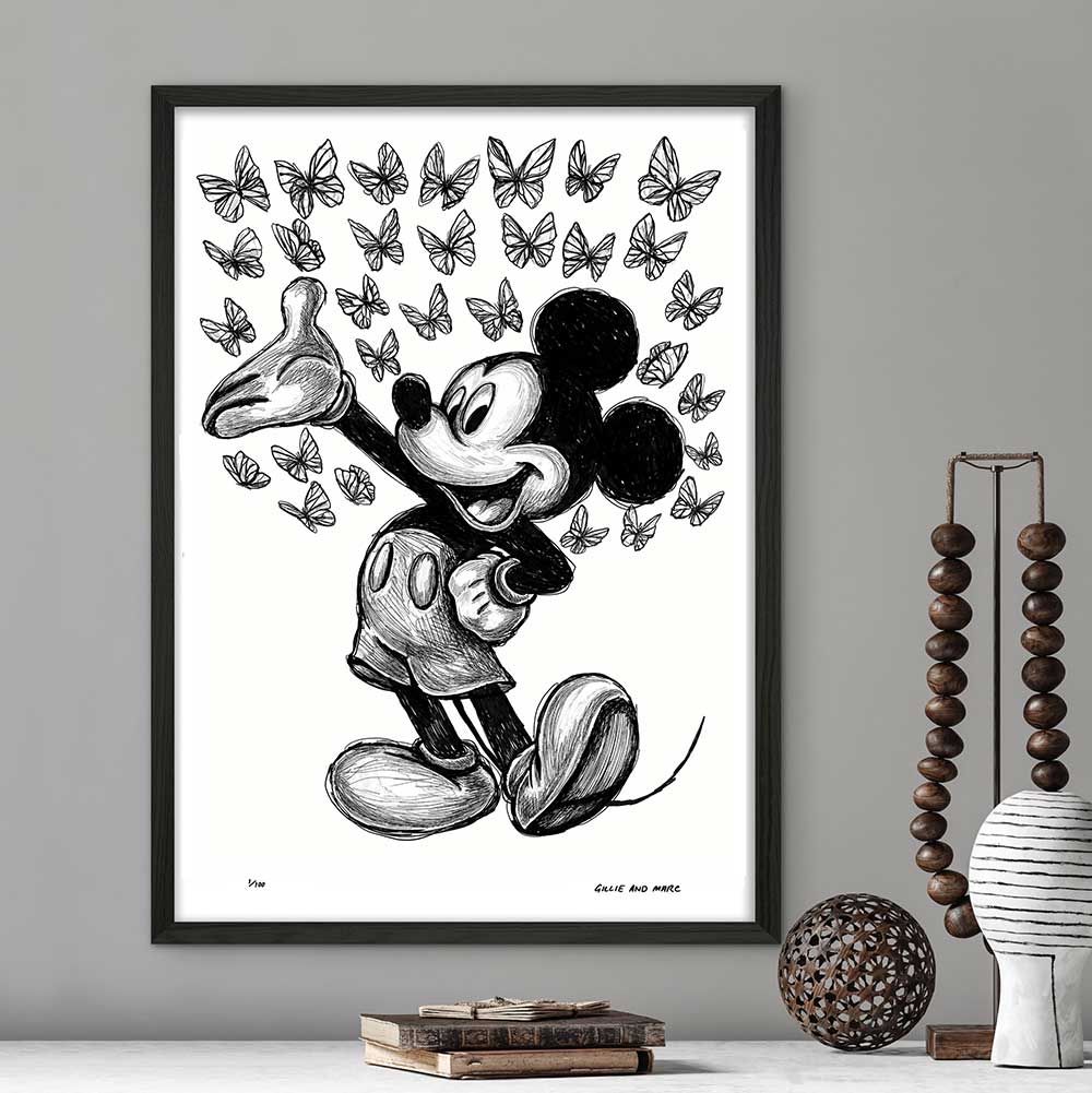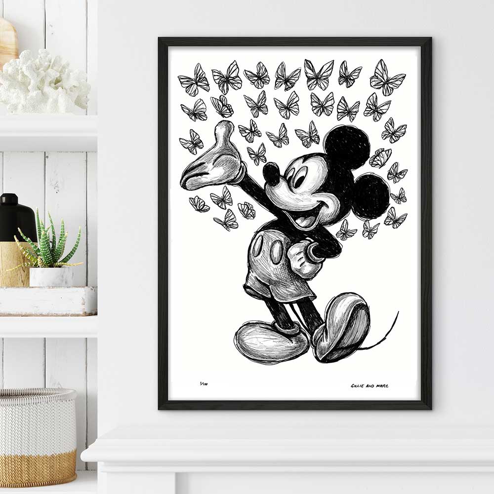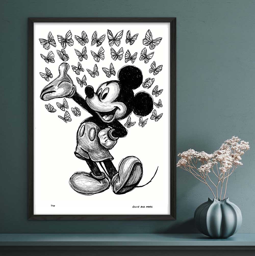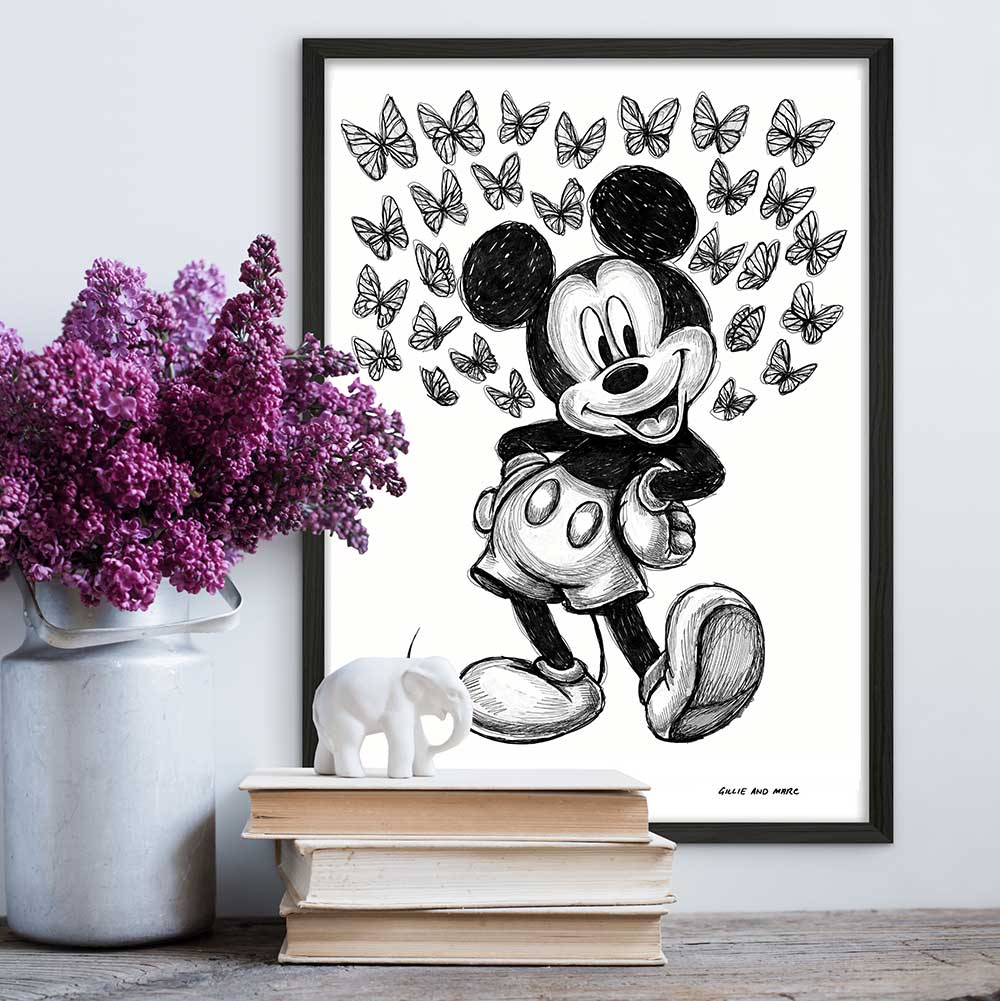 This charming illustration captures Mickey in a joyful, confident pose as a flutter of butterflies surrounds him. His playful stance and warm smile radiate positivity, bringing to life the timeless spirit that has made him an icon for generations. The expressive black-and-white sketch style adds movement and texture, giving the piece an energetic, hand-drawn feel.
