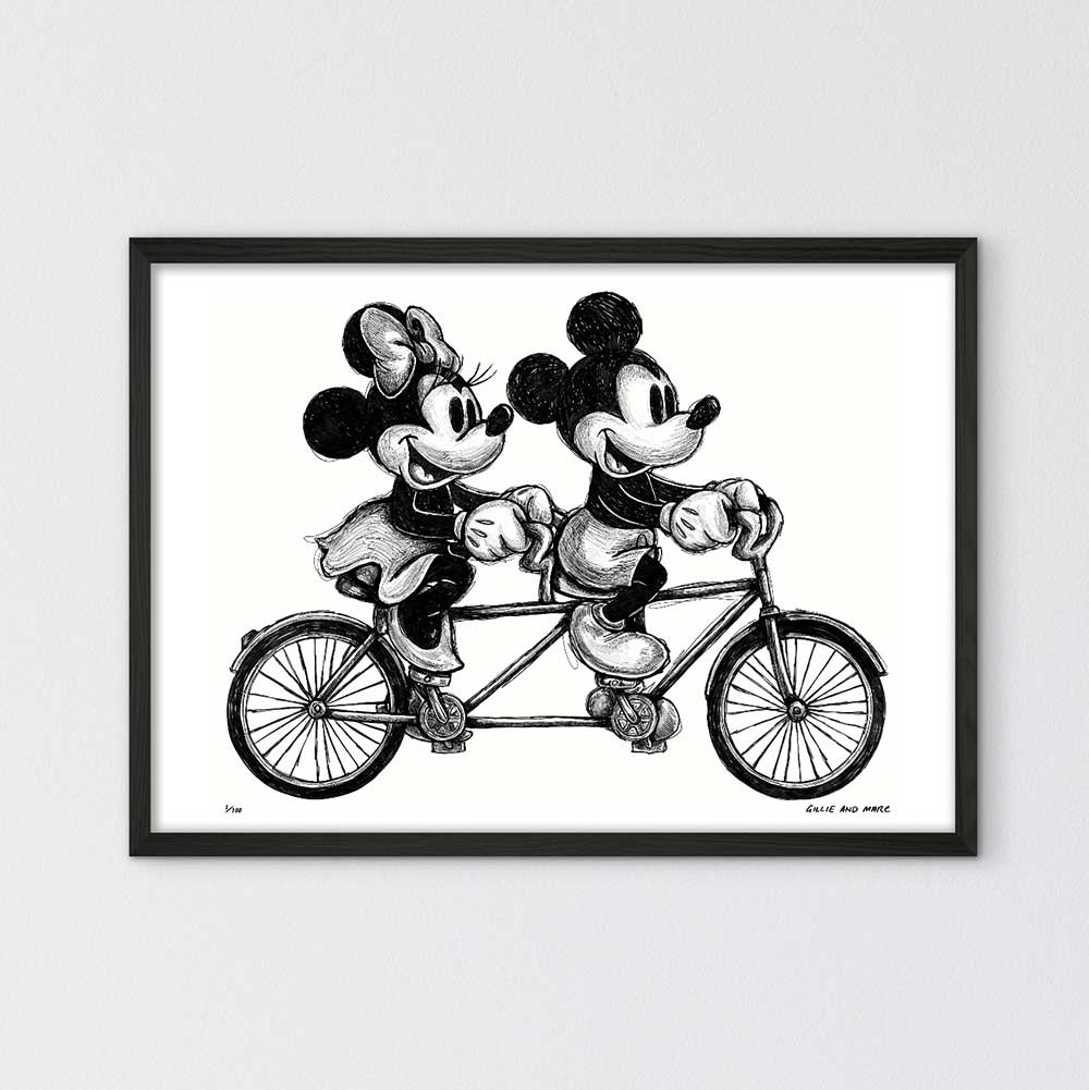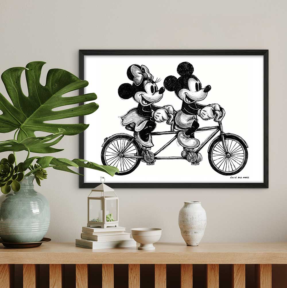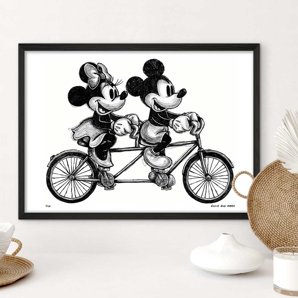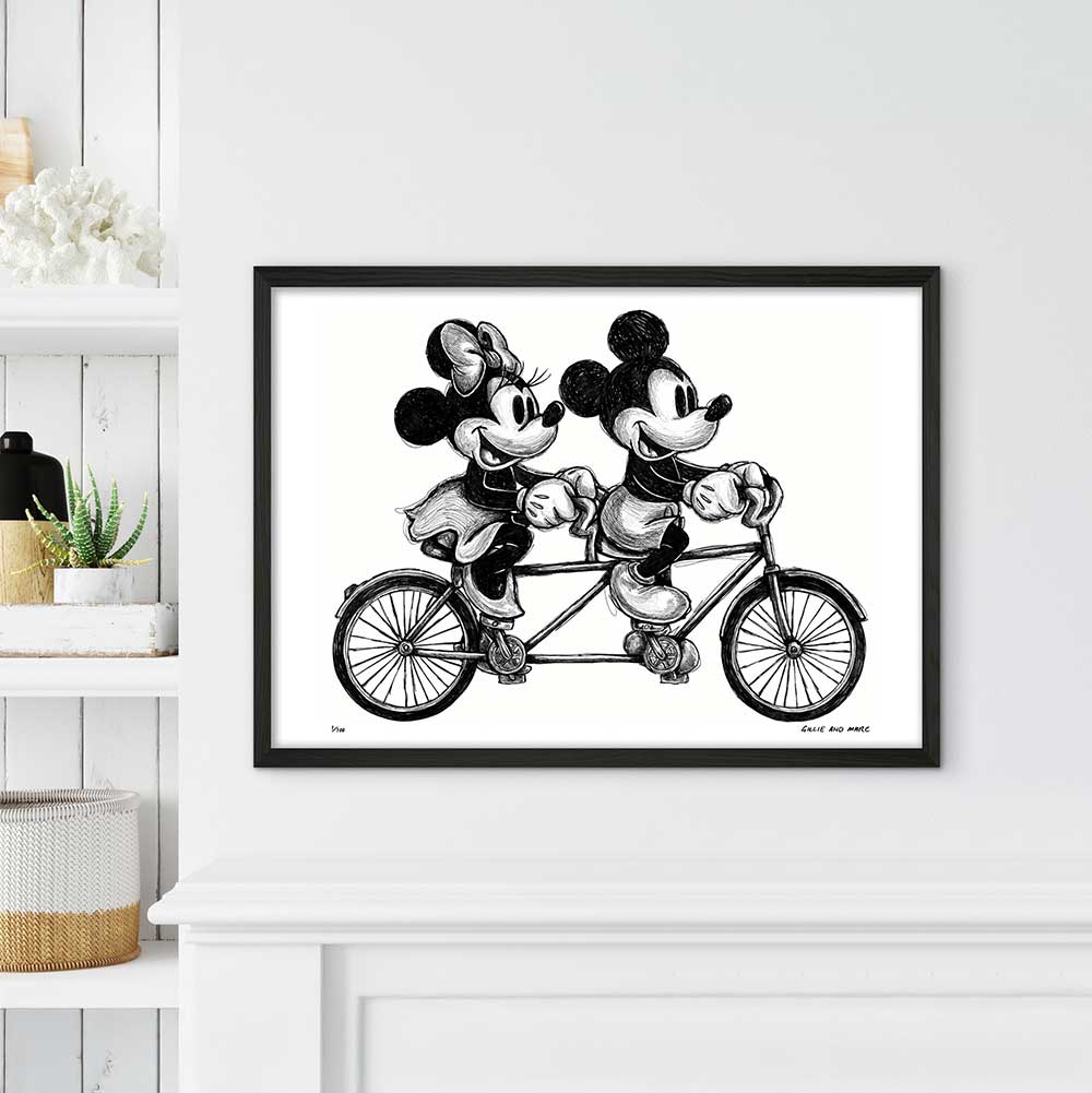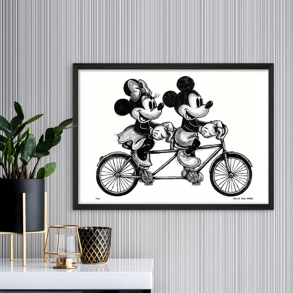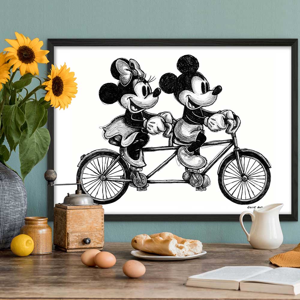 Joyful, nostalgic, and full of charm, “Mickey and Minnie on the Ride of a Lifetime” celebrates the timeless love between two of the world’s most iconic characters. Riding together on a tandem bicycle, Mickey leads with enthusiasm while Minnie follows close behind, smiling with effortless grace. Their hands meet gently in the centre, symbolising partnership, trust, and the happiness of sharing life’s journey side by side.