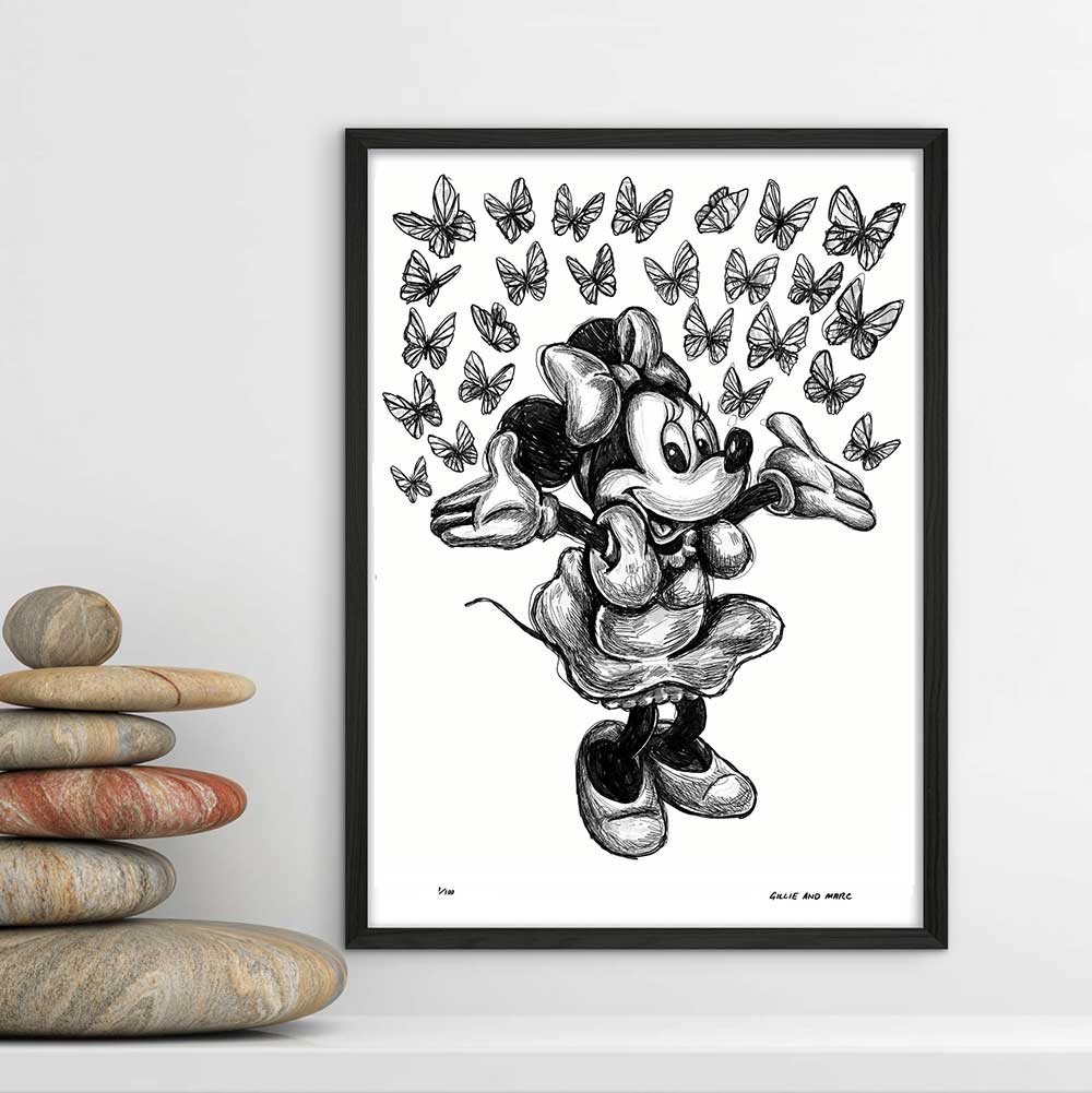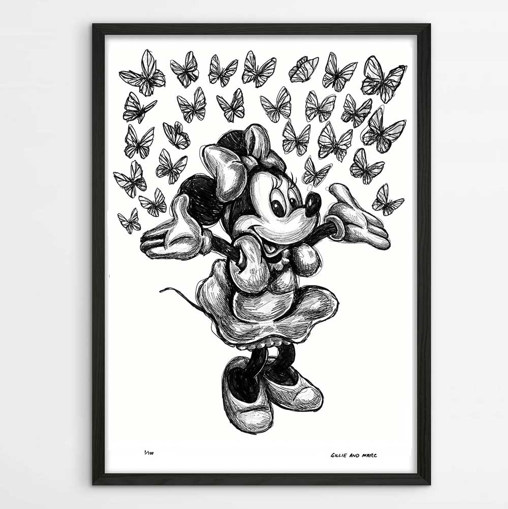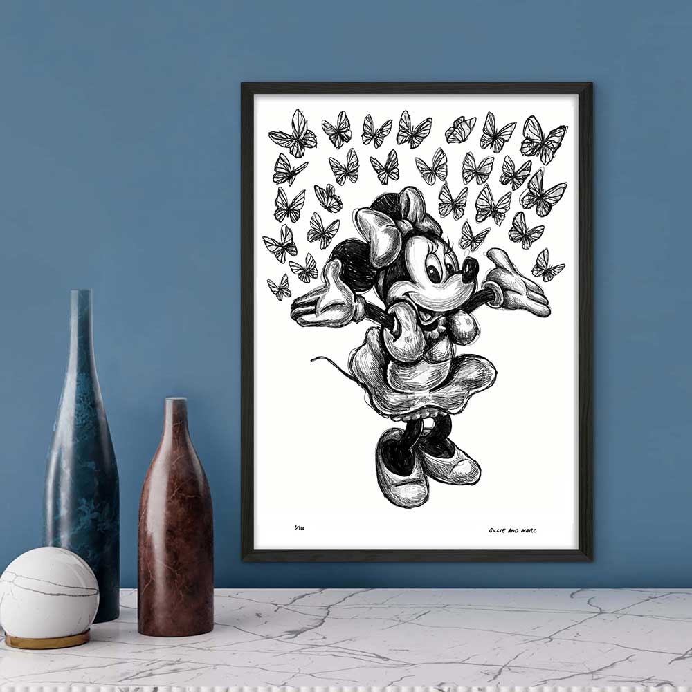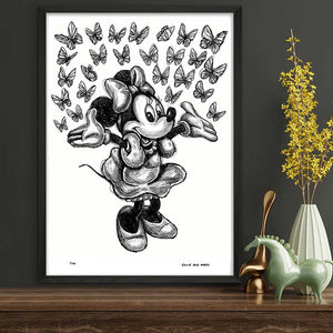Minnie bursts into the scene with pure joy, surrounded by a flutter of delicate butterflies that seem to dance with her energy. Drawn in bold, expressive black-and-white strokes, she captures the magic of nostalgia and the playfulness of imagination. Her open arms and bright smile create a feeling of welcome and wonder, as if she’s inviting you to step into her world of happiness. This piece beautifully balances whimsy and elegance, making it a charming celebration of positivity and timeless character.