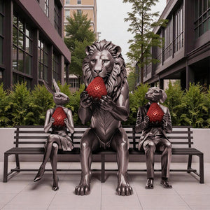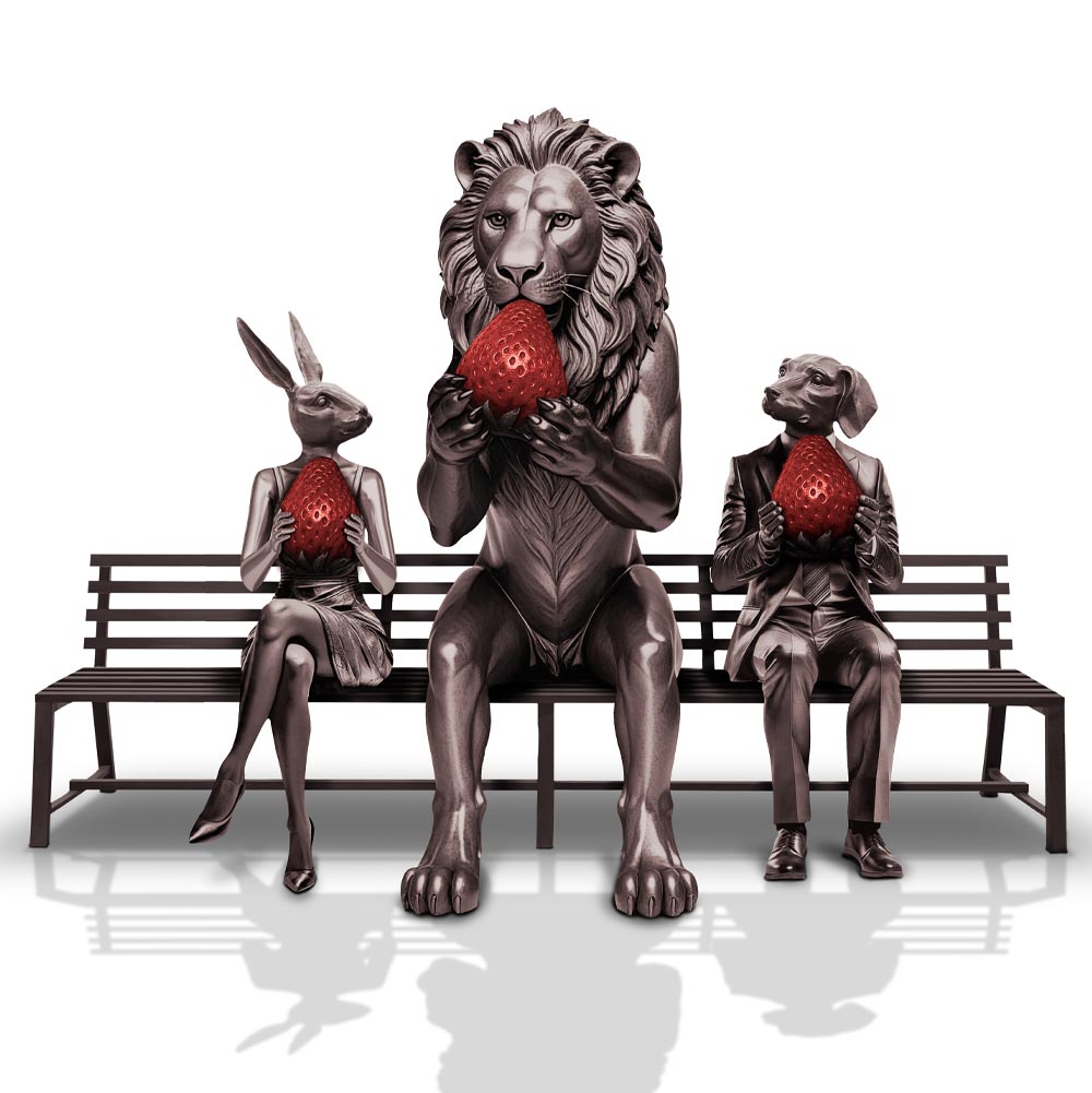 Description A captivating bronze sculpture bench draws the public into a scene of joy and vitality as Rabbitwoman and Dogman sit beside an endangered West African lion, sharing in the playful indulgence of eating giant strawberries. The lion, positioned at the center of the bench, becomes the focal point of this gathering, symbolizing both power and vulnerability — a king of beasts whose survival depends on the care and respect of humankind.On either side, Rabbitwoman and Dogman — Gillie and Marc’s beloved Wildlife Warriors — eat strawberries alongside the lion, embodying harmony, guardianship, and the possibility of coexistence. Their open posture leaves room on both ends of the bench, inviting the public to join in, sit close, and take part in this whimsical feast. The lion itself represents strength, courage, and the fragile majesty of the natural world. Placed between Rabbitwoman and Dogman, it becomes a symbol of trust and togetherness — a reminder that even the most powerful creatures need protection. The act of sharing strawberries, sweet and abundant, is transformed into a metaphor for generosity, unity, and the simple pleasures that bridge the distance between species. The Lion Bench of Friendship is more than a seat — it is a joyful call to nurture, protect, and savor the beauty of endangered wildlife before it is lost.