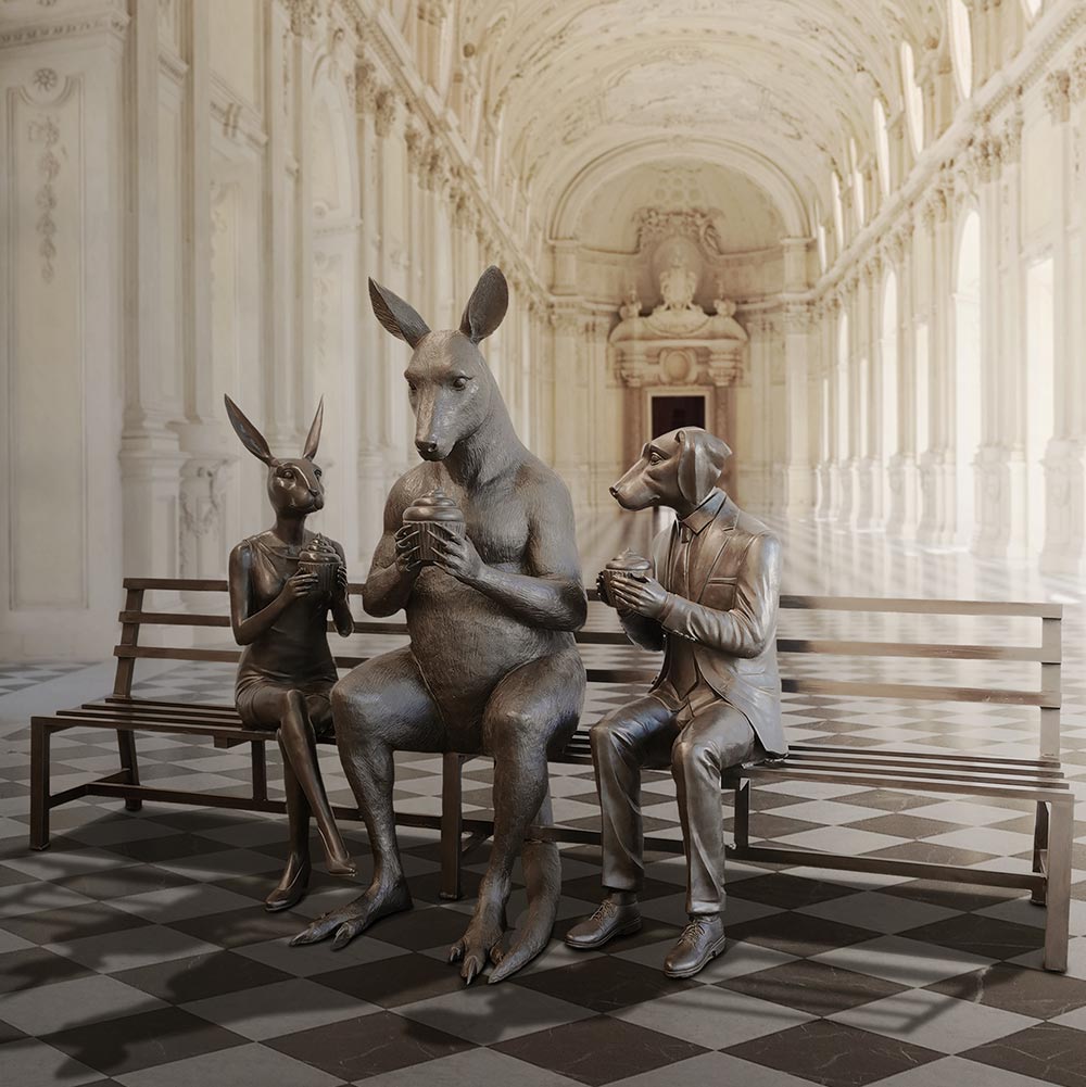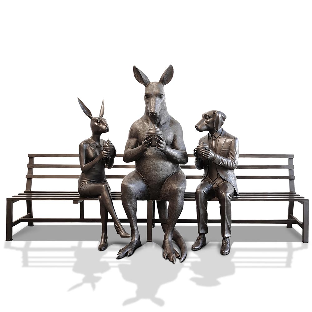 Description The sculpture titled "The Kangaroo Bench of Friendship" depicts Rabbitwoman and Dogman seated beside a gentle kangaroo, all three companions joyfully sharing cupcakes. Symbolizing unity, care, and our responsibility to protect the wild, the kangaroo embodies resilience while Rabbitwoman and Dogman highlight the harmony possible between humans and animals. Uniquely, the bench invites the public to sit alongside Rabbitwoman and Dogman, joining the circle of friendship and experiencing the warmth of companionship with all three figures—a reminder that genuine connection and stewardship extend beyond humanity to embrace the natural world.