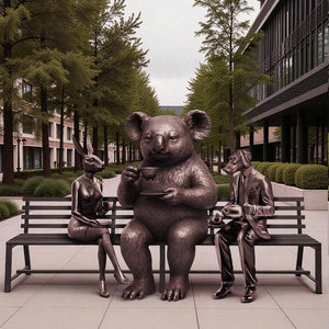 Description A captivating bronze sculpture bench invites the public into a moment of warmth and intimacy as Rabbitwoman and Dogman sit beside an endangered Eastern koala, sharing a cup of tea and quiet conversation. The koala, placed at the center of the bench, becomes the heart of this gathering, symbolizing the fragile yet vital presence of endangered species in our shared world. On either side, Rabbitwoman and Dogman — Gillie and Marc’s beloved Wildlife Warriors — cradle their tea cups, embodying the guardianship and companionship humans can offer to wildlife. Their posture of openness leaves space on both ends of the bench, inviting members of the public to join the circle and become part of the conversation. The koala itself represents gentleness and the delicate balance of nature. Its placement between Rabbitwoman and Dogman emphasizes unity: animals and humans side by side, sharing the same space, the same moment, and the same future. The act of sipping tea, simple yet profound, is transformed into a metaphor of connection and care. It reminds us that by slowing down, sharing time, and truly sitting with endangered species, we can cultivate empathy. The Koala Bear Bench of Friendship becomes more than a seat — it is a symbol of kinship, reflection, and the urgent need to protect the creatures who depend on us.