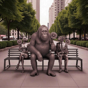 Description A captivating bronze sculpture bench invites the public into a moment of beauty and reflection as a critically endangered Tapanuli orangutan sits at the center, holding a giant flower, with Rabbitwoman and Dogman seated on either side mirroring the gesture. Together, the trio creates a scene of quiet harmony, each figure cradling their flower as if it were the most precious gift. The orangutan represents wisdom, gentleness, and the fragile balance of the rainforest it calls home. Its place at the heart of the bench underscores its role as a symbol of both vulnerability and resilience. On either side, Rabbitwoman and Dogman — Gillie and Marc’s beloved Wildlife Warriors — hold their own giant flowers, embodying guardianship and solidarity. Their openness leaves space at both ends of the bench, inviting the public to sit, join in, and symbolically become part of this circle of care. The flowers themselves carry rich symbolism. They are fragile yet radiant, reminding us of the delicate beauty of nature and the fleeting opportunity we have to protect it. In the hands of the orangutan, the flower becomes a metaphor for the rainforest itself — vital, life-giving, and in need of protection. The Orangutan Bench of Friendship becomes more than a seat — it is a symbol of kinship, reflection, and the urgent need to protect these extraordinary great apes and the forests they depend on.