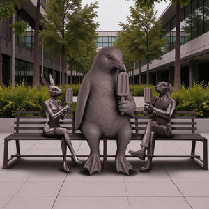 Description A captivating bronze sculpture bench invites the public into a scene of joy and reflection as Rabbitwoman and Dogman sit beside an endangered penguin, all three sharing the simple pleasure of eating icy poles together. The penguin, placed at the center of the bench, becomes the heart of this gathering, symbolizing both resilience in harsh environments and the fragile beauty of species now critically endangered. On either side, Rabbitwoman and Dogman — Gillie and Marc’s beloved Wildlife Warriors — mirror the penguin’s action, each holding their own icy pole. Their playful gesture emphasizes equality and companionship, showing that humans and animals can share in the same small pleasures of life. The openness of their posture leaves space on both ends of the bench, inviting the public to sit, join in, and become part of this moment of connection. The act of eating icy poles, lighthearted and fun, carries deeper symbolism. For the penguin, the icy treat evokes its frozen homeland — a poignant reminder of the ecosystems melting away under the threat of climate change. What appears whimsical at first glance becomes a gentle call to awareness: joy and sweetness must be protected, or they will melt away like ice in the sun.By joining this scene, visitors are reminded that conservation is not only about survival but also about preserving the joy, playfulness, and wonder of the natural world. The Penguin Bench of Friendship becomes more than a seat — it is a symbol of kinship, delight, and the urgent need to safeguard these extraordinary creatures before their icy world disappears forever.