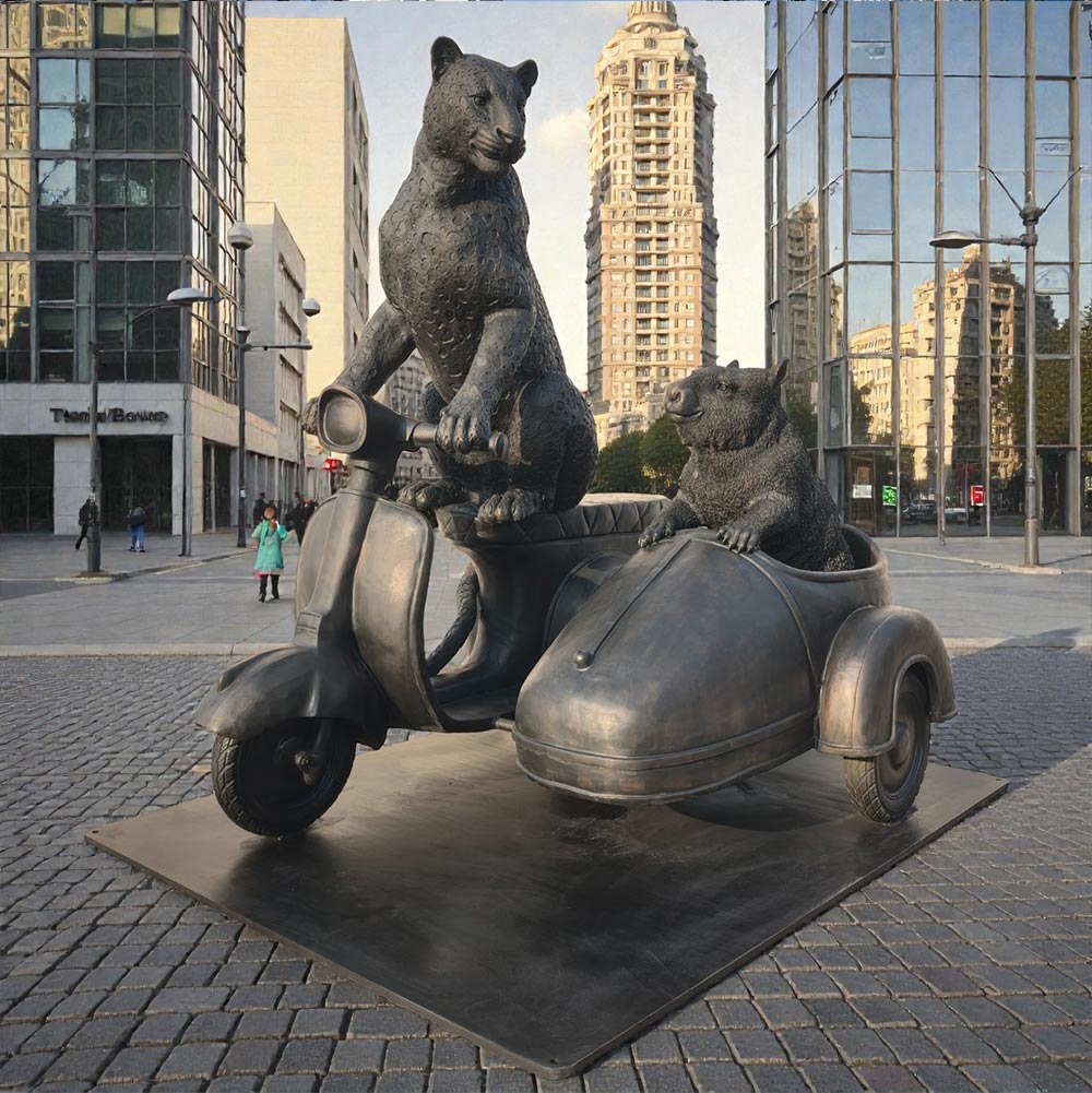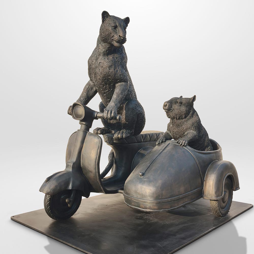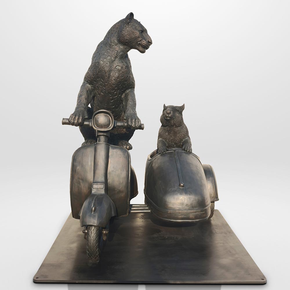 The Amur Leopard and Hairy Nosed Wombat Race in the Vespa Side Car (Bronze Sculpture)