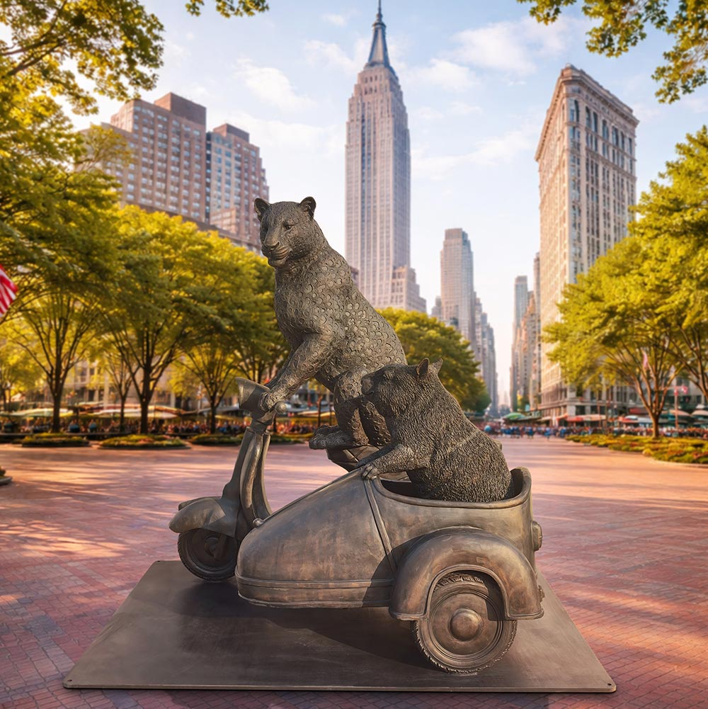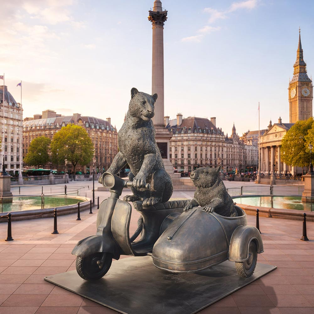 This is an enchanting bronze sculpture that captures a thrilling moment of interspecies camaraderie and adventure. The piece features a sleek, muscular Amur Leopard, poised with effortless grace and a look of focused exhilaration, leaning into the wind as it drives a vintage Vespa. Nestled snugly in the sidecar, the endearing hairy-nosed wombat peers out with wide-eyed excitement. Both the Amur Leopard and the Northern Hairy-Nosed Wombat are among the world’s most endangered animals, and their presence in this work underscores the urgent need for conservation efforts. Behind the leopard, an open, inviting spare seat extends from the Vespa — a symbolic invitation for the public to join this joyful yet critical journey, riding alongside these rare creatures in the fight to protect them. This whimsical sculpture not only delights with its narrative of speed, friendship, and shared purpose, but also serves as a powerful call to action, urging viewers to embrace the unexpected adventures life may offer — and to stand together in safeguarding the fragile wonders of our natural world.