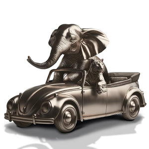 This is a captivating bronze sculpture that harmoniously combines the raw power of wildlife with the nostalgic charm of a classic car. The sculpture depicts a lively scene where a majestic Bengal tiger, with its muscular frame, confidently takes the wheel of a vintage Volkswagen Beetle. Beside the tiger, the grand Sumatran elephant, rides, trunk in the air. Both the Bengal tiger and the Sumatran elephant are endangered species, a poignant reminder of the urgent need to protect them from the threats of habitat loss, poaching, and human conflict.