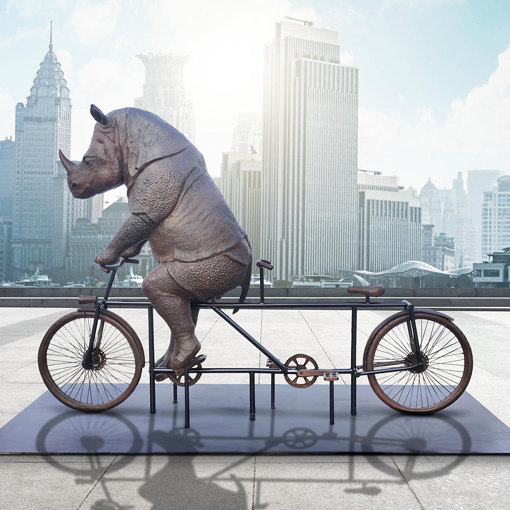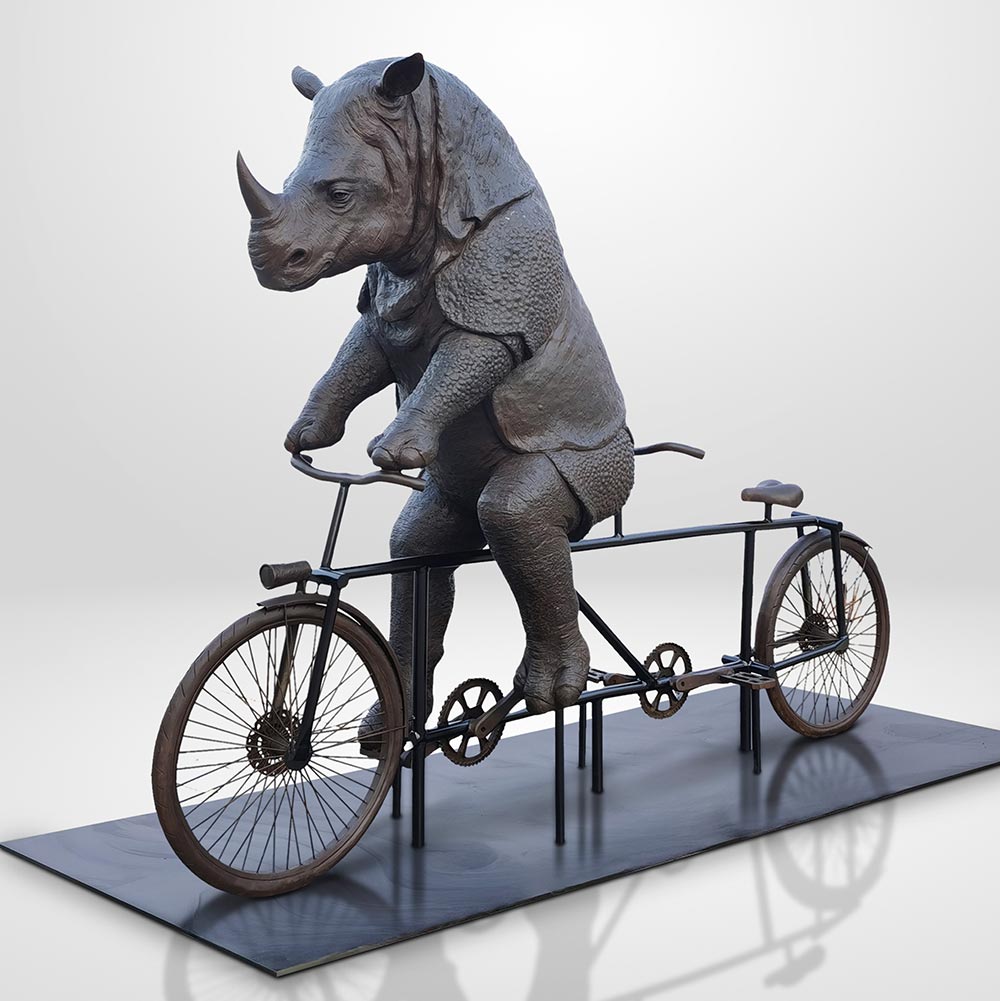 This is a whimsical and thought-provoking bronze sculpture that combines one of the world’s rarest animals with an unexpected mode of modern transportation. The rhino’s expression exudes determination and a touch of playful mischief, as though fully aware of the novelty of its endeavor. With its small, forward-pointing horn catching the light and its massive legs pedaling with surprising grace, the scene invites both laughter and contemplation. A spare seat fixed just behind the rhino’s saddle extends a unique invitation to the public—an open call to join the journey, symbolizing shared responsibility in the race to protect our planet’s biodiversity. Beyond its lighthearted charm, the sculpture carries a deeper message about conservation and adaptability. The Javan rhino, critically endangered and seldom seen in the wild, symbolizes resilience and the urgent need to preserve fragile ecosystems. By placing this powerful creature in a distinctly human context—racing on a bicycle and leaving room for us to ride along—the piece draws attention to the intersection of nature and human progress, encouraging viewers to consider how coexistence can be achieved in a changing world.