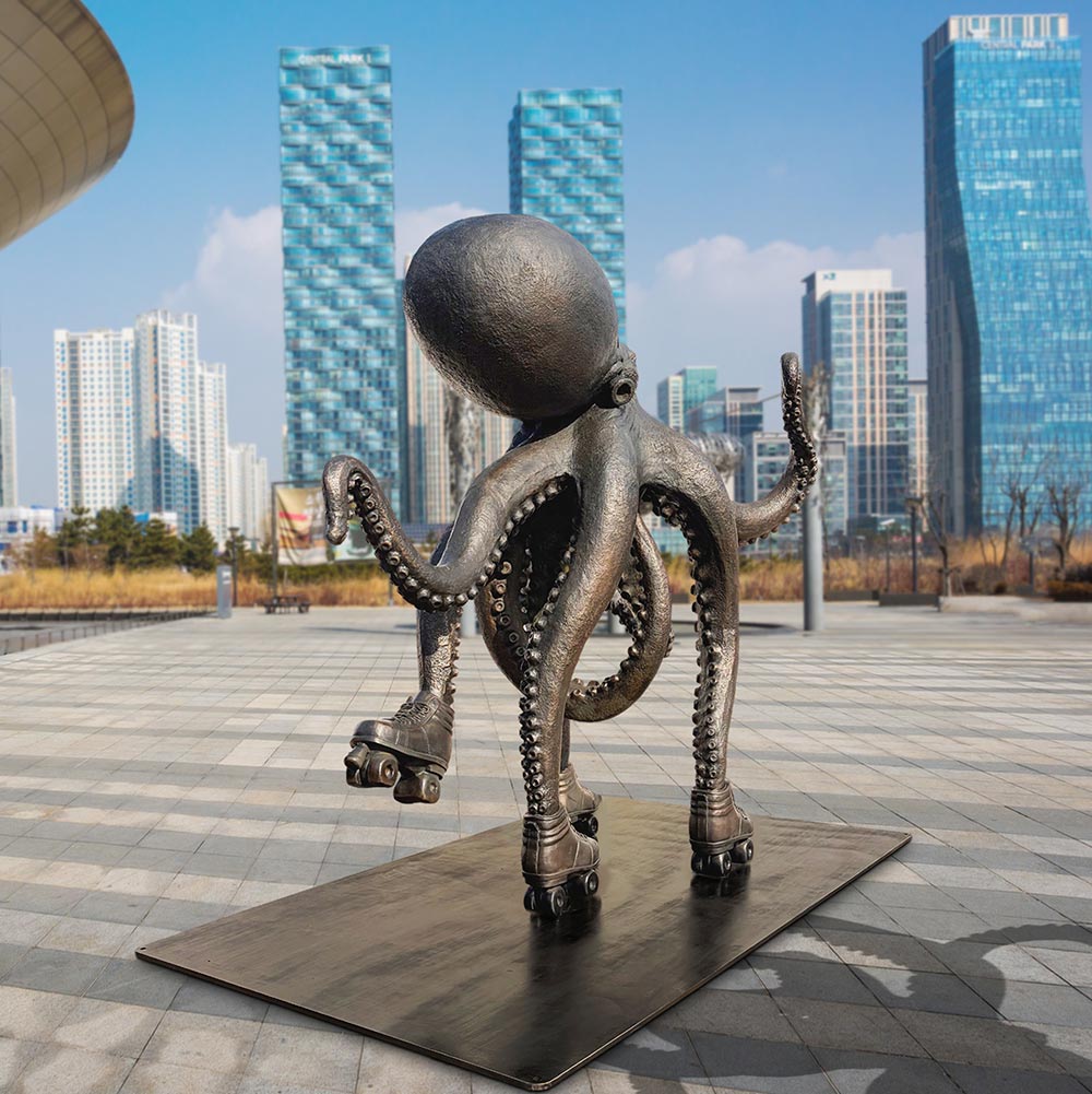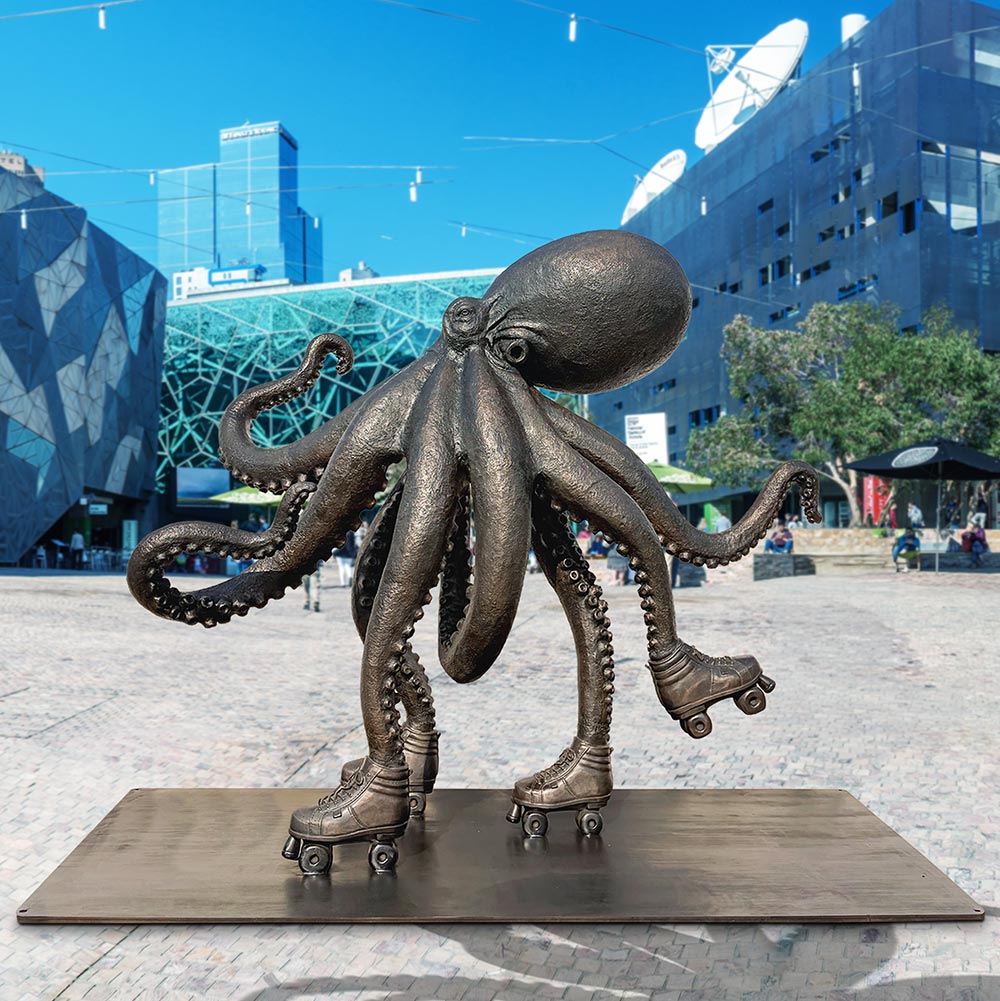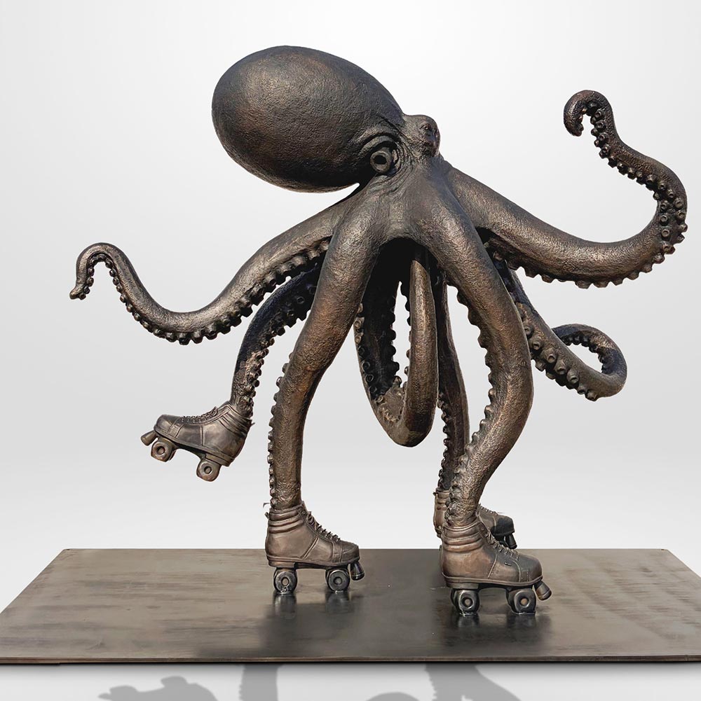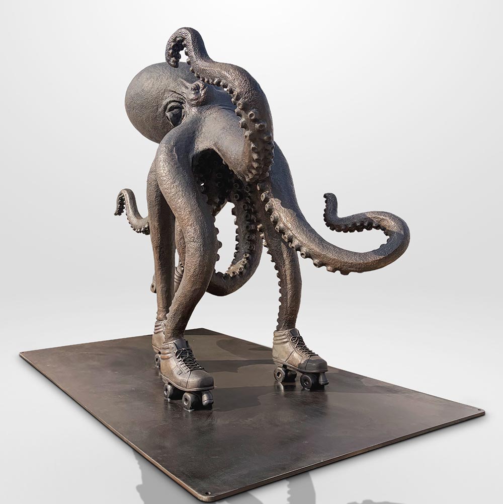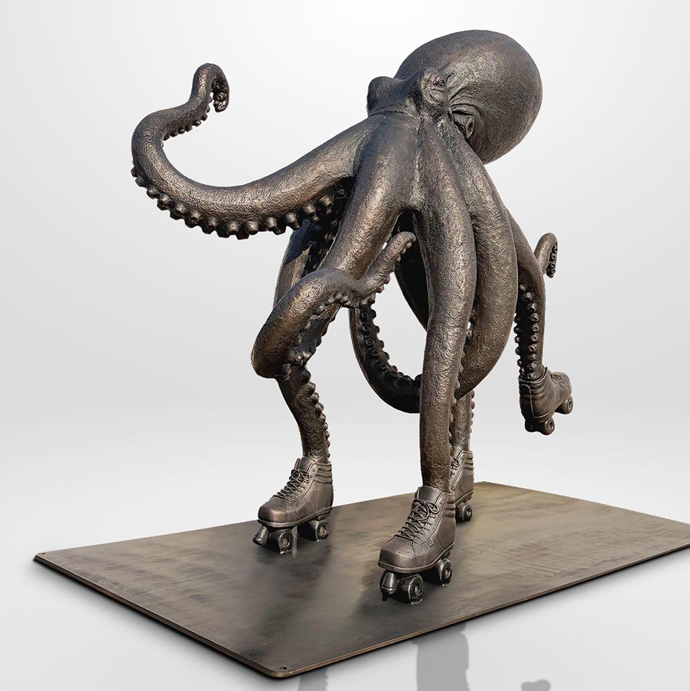 The artwork depicts a Kermadec octopus (Callistoctopus kermadecensis), a rare deep-sea species found exclusively around a remote volcanic island chain northeast of New Zealand, its body radiating quiet strength and fluid motion, while four of its slender arms balance firmly atop roller skates. The other arms extend outward like fluid ribbons in the dark, curling and reaching as though charting a path between the ocean depths and the surface world. The open space surrounding the figure invites viewers to imagine themselves skating alongside this elusive octopus, caught up in a surreal race where abyssal mystery meets human play. Beyond its whimsy, the sculpture serves as a poignant reminder of how little we know about deep-sea life, and how easily such fragile species could be lost. The octopus is vulnerable to human activity that alters deep ocean ecosystems, making it a symbol of both wonder and precarity. In its unusual balance—half grounded, half unfurling—the piece reflects the tension between resilience and vulnerability that defines life in the deep. With humor, elegance, and a touch of surreal imagination, The Octopus Races on Roller Skates sparks curiosity and reflection, urging us to consider the fragile beauty of the unknown.
