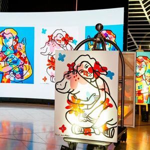 This collection of pop moments exhibited at Pullman Melbourne on the Park is an assortment of characters and stories that pop out of the frame in colour and fun. With the contrast of dark outlines with bright, patchwork patterns inside, Gillie and Marc have created a series of paintings that provide the viewer with a sense of joy and whimsy. Every moment is filled with positivity and love.