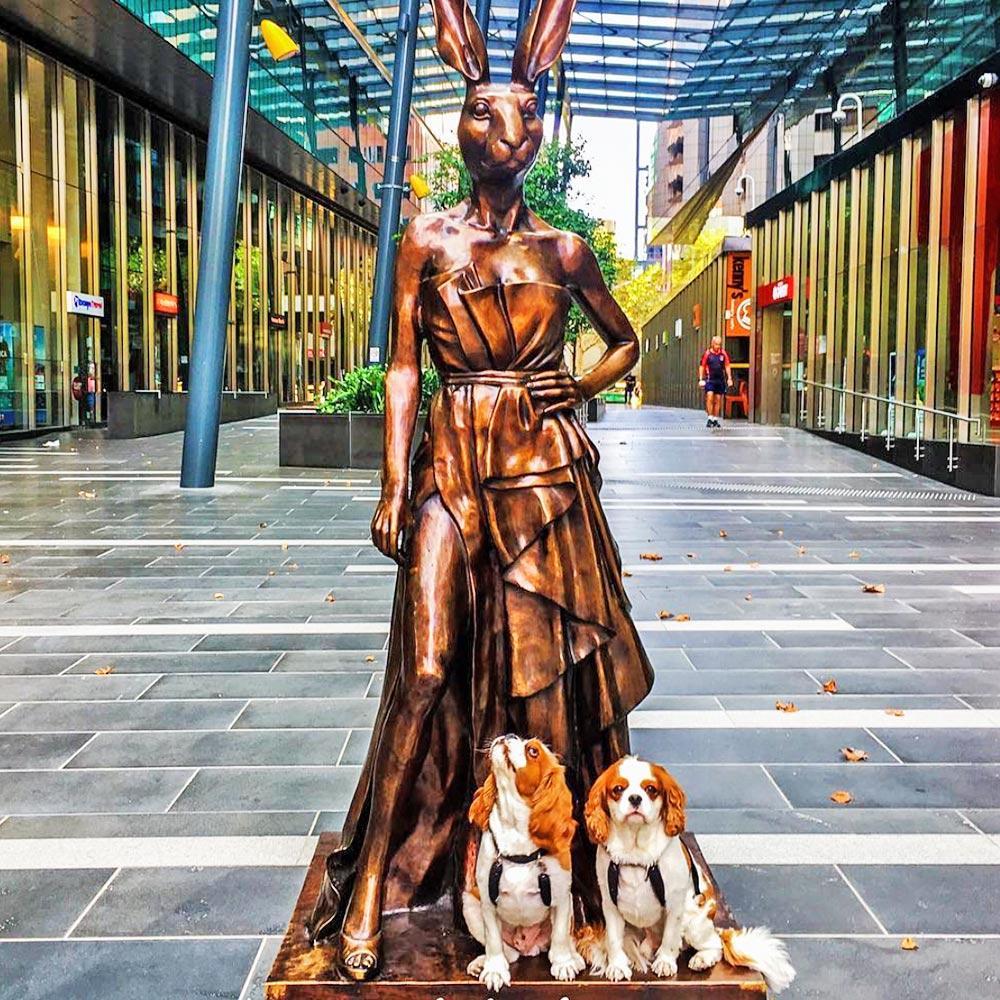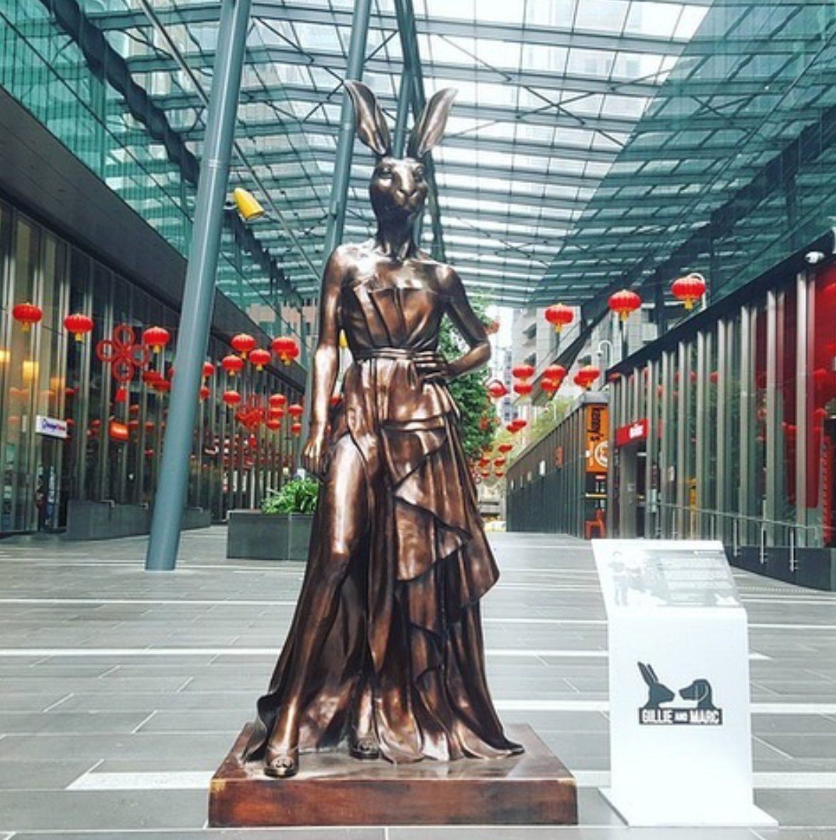Gillie and Marc have always found Angelina Jolie to be a huge source of inspiration – largely due to her humanitarian efforts with conservation, education and women’s rights. In this 2.2metre tall artwork titled Angelina Rabbitgirl — Stronger than ever, the Hollywood actress stands strong to show that even through all her ups and downs she will never give up. Angelina Rabbitgirl is dressed in the iconic thigh-high slit gown that the film star wore to the 2012 Oscars. The Atelier Versace black velvet dress made Jolie’s right leg the most talked about limb in celebrity history. This sculpture is part of the Celebrity Animal series – a posse of A-listers which includes Arnold ‘Stag’ Schwarzenegger, Pamela ‘Poodle’ Anderson, Dr ‘Bear’ Evil, Michael ‘Dog’ Jackson and Jessica Rabbit. “Everyone has a fascination with celebrity but it’s difficult to get close and engage them,” explained Gillie. “So we came up with the hybrid idea so everyone could have that feeling of a little bit of fame.” Marc said they were also parodying celebrity culture. “Celebrities are the new royalty and shopping centres are the new galleries of the world.”