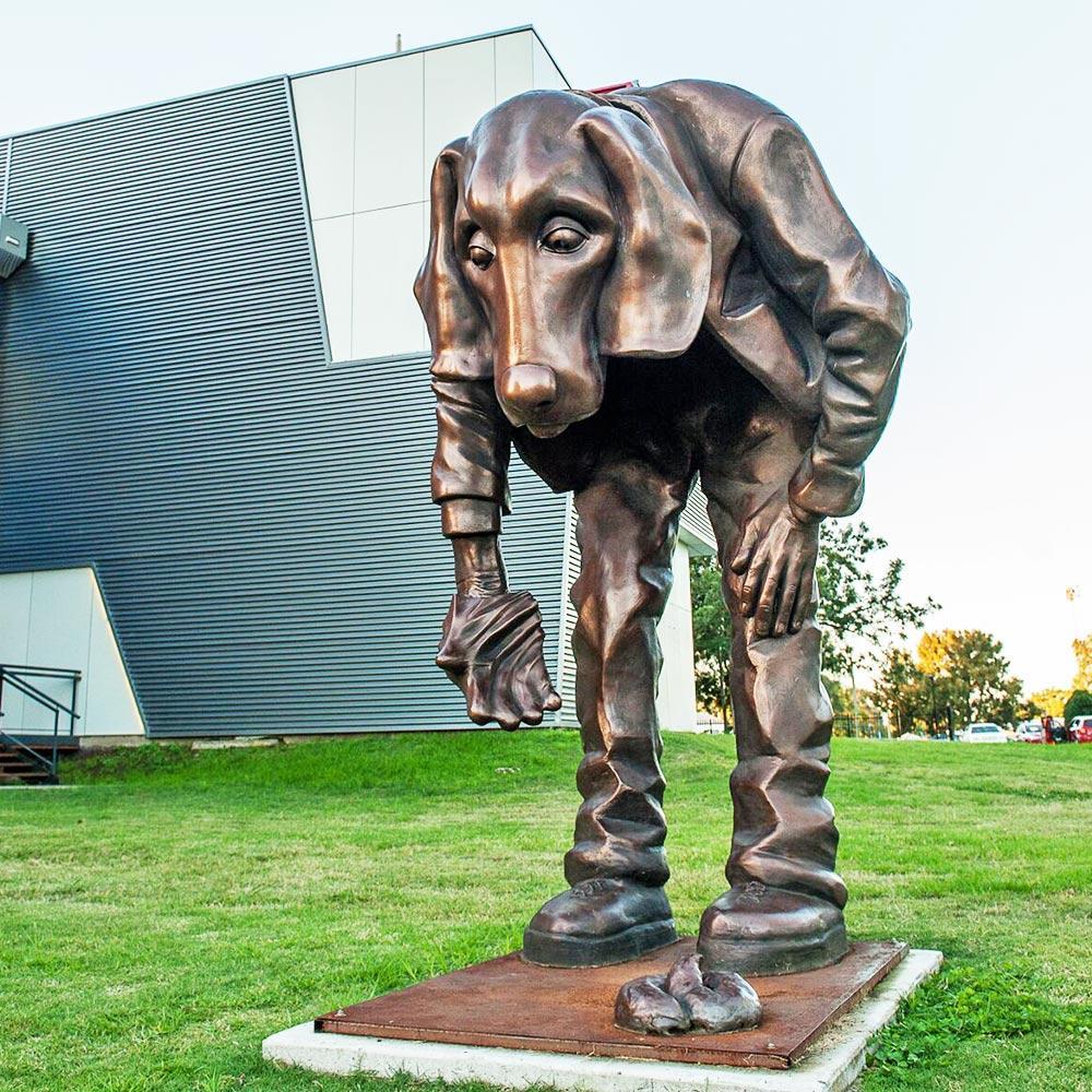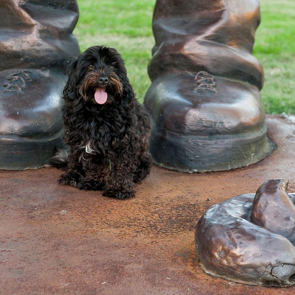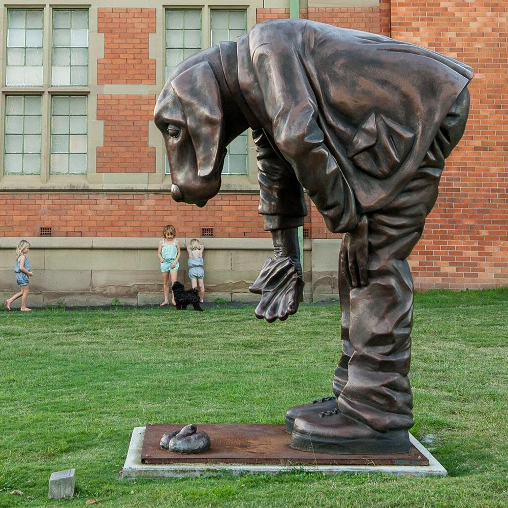 Installed permanently at the Maitland Art Gallery. Fetch Boy is one of Gillie and Marc’s most recognisable and controversial works. It’s on permanent display at Maitland Regional Art Gallery and is a favourite of both locals and tourists. When Fetch Boy went on a brief hiatus, everyone was aghast. The Maitland Mercury covered its departure and the gallery even threw a “pooch picnic” to celebrate its return. The three-metre tall, suit-wearing dog who is picking up its own poo, caused a stir from the moment of its installation. “Within half an hour of him being placed in his grassy, well fenced ‘yard’ we had people come in, who’d never been inside the gallery before, asking about our dog and if they could get a closer look,” explained Gallery Curator, Cheryl Farrell. “Within a day we had the Maitland Mercury down to take a photo for a front page feature, and within two days the Sydney Telegraph were in touch to take photos and write a story. Within a week a new route had been established by families visiting the gallery that incorporated a visit to Fetch Boy before coming through the front doors.”