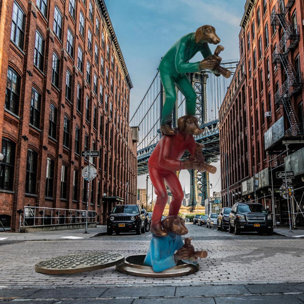 Standing on top of each others shoulders to form a tower, the three dogs are coming out of the ground and on to the streets. Once hidden, they come as a surprise, growing almost like a tree out of a manhole. With the symbols of the manhole and the paparazzi, this sculpture is the manifestation of an urban jungle.
