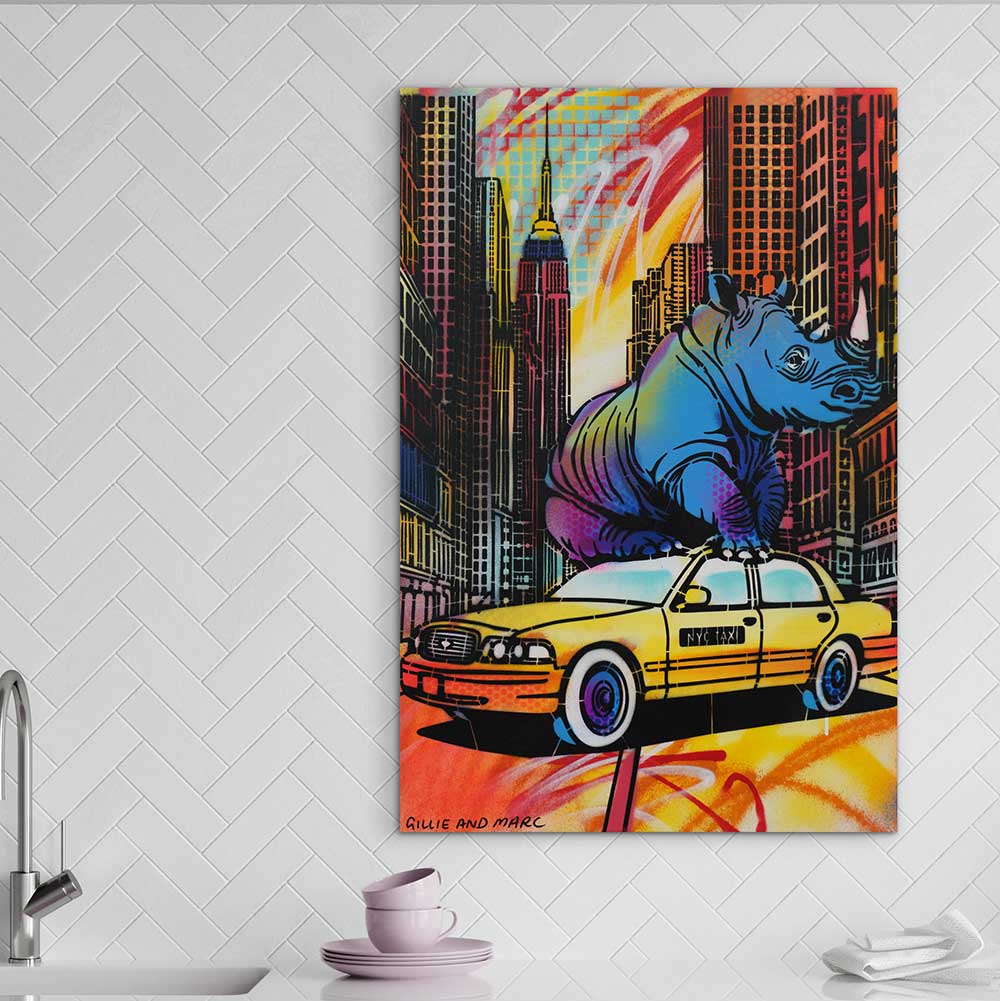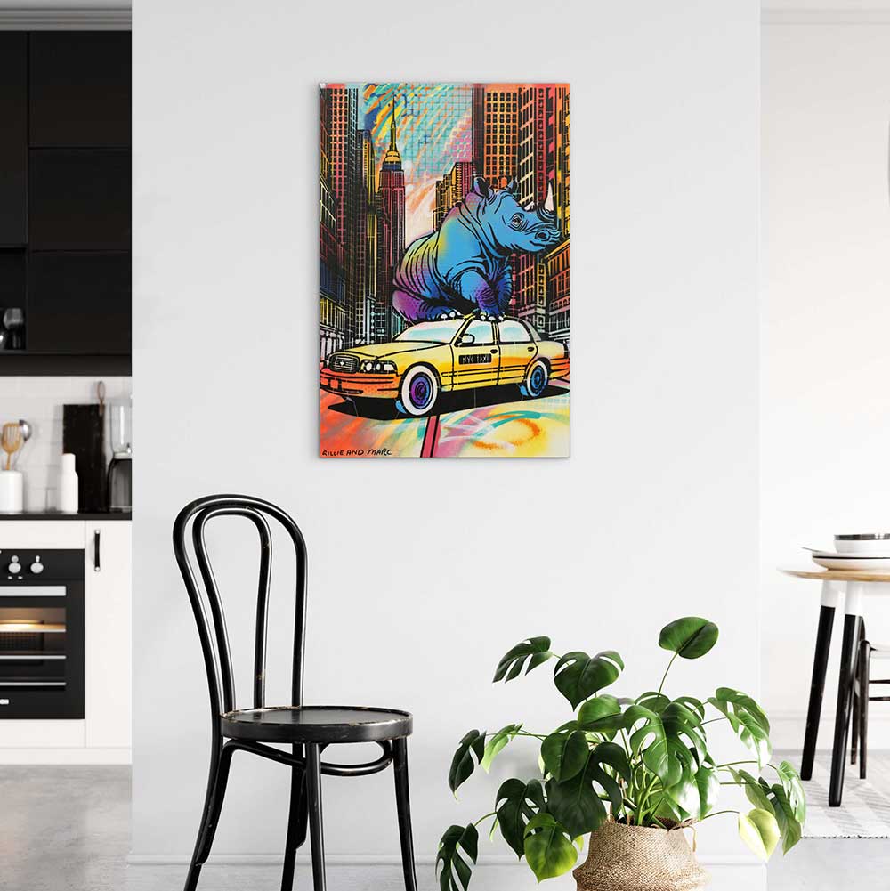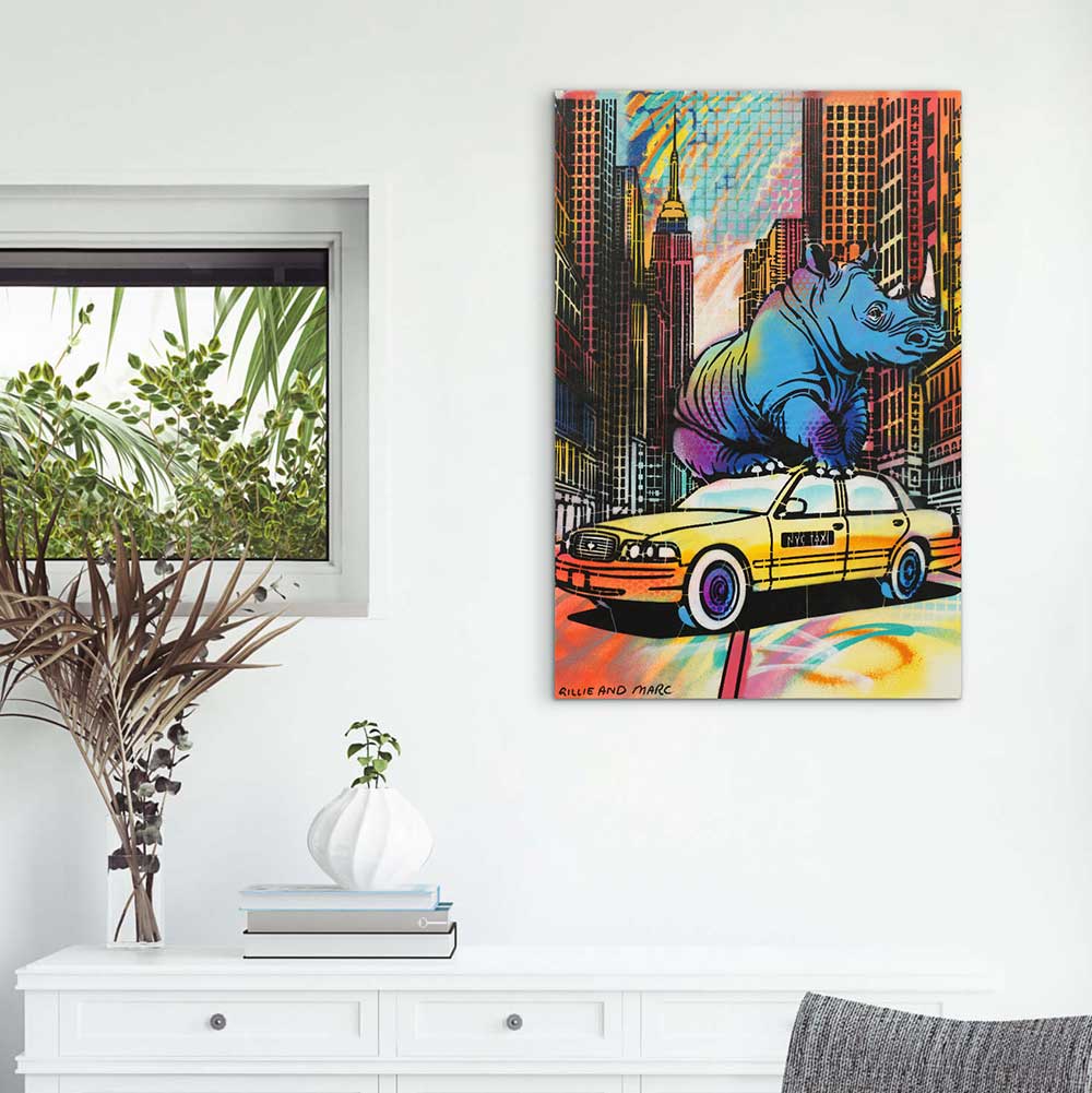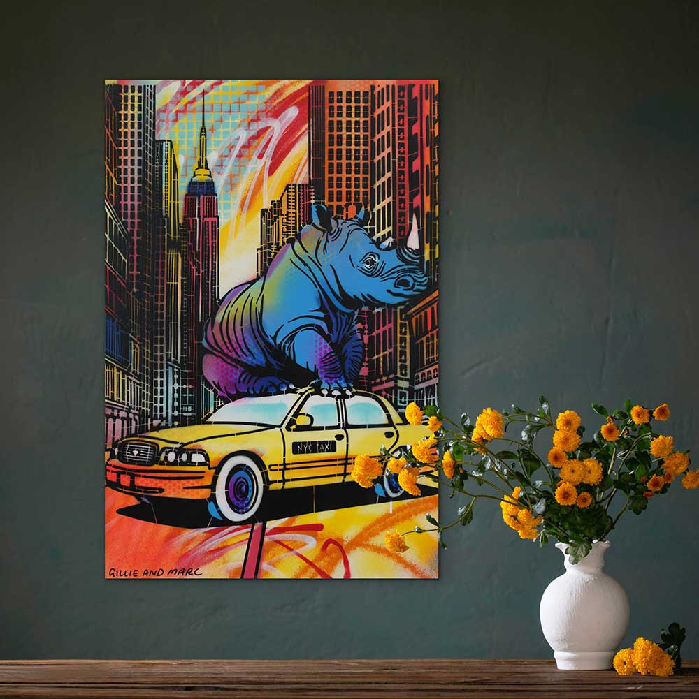 Description A brilliant blue rhino perches atop a classic yellow NYC taxi, set against a dazzling neon skyline. The pop-art colours and bold stencil lines pulse with urban energy and wild freedom. This playful clash of city and nature sparks imagination and wonder. Each vibrant layer celebrates strength, resilience, and the unexpected beauty of coexistence. The artwork invites viewers to see New York as a place where the extraordinary becomes possible.