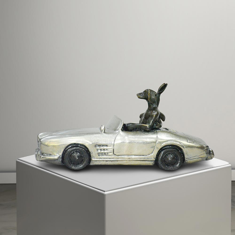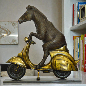 This whimsical and captivating bronze sculpture reimagines the majestic African elephant in an unexpected and playful setting: racing against time atop a classic vintage Vespa. The piece portrays the elephant’s immense, powerful body balanced with delightful improbability, its expressive trunk lifted as if catching the wind while the scooter speeds forward with spirited motion.