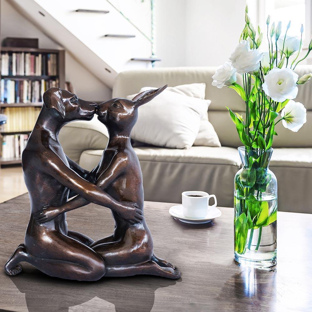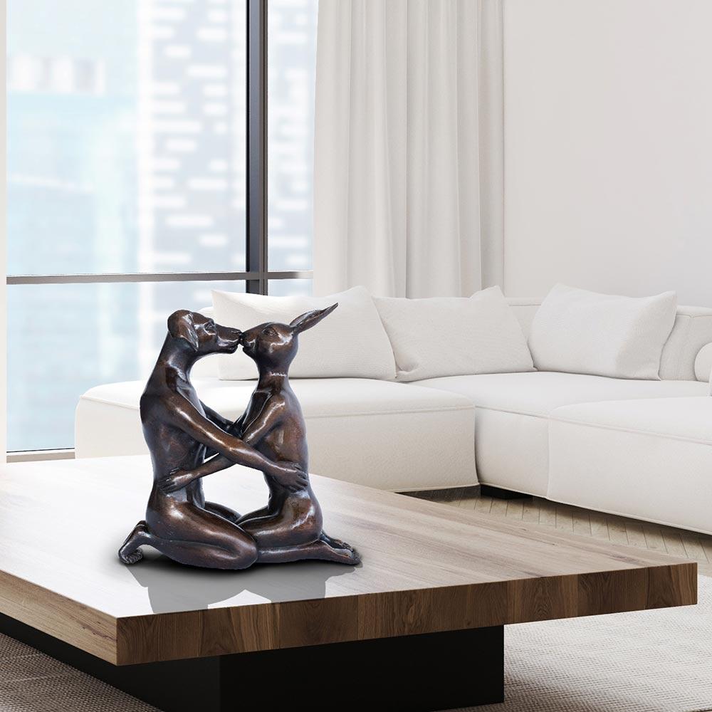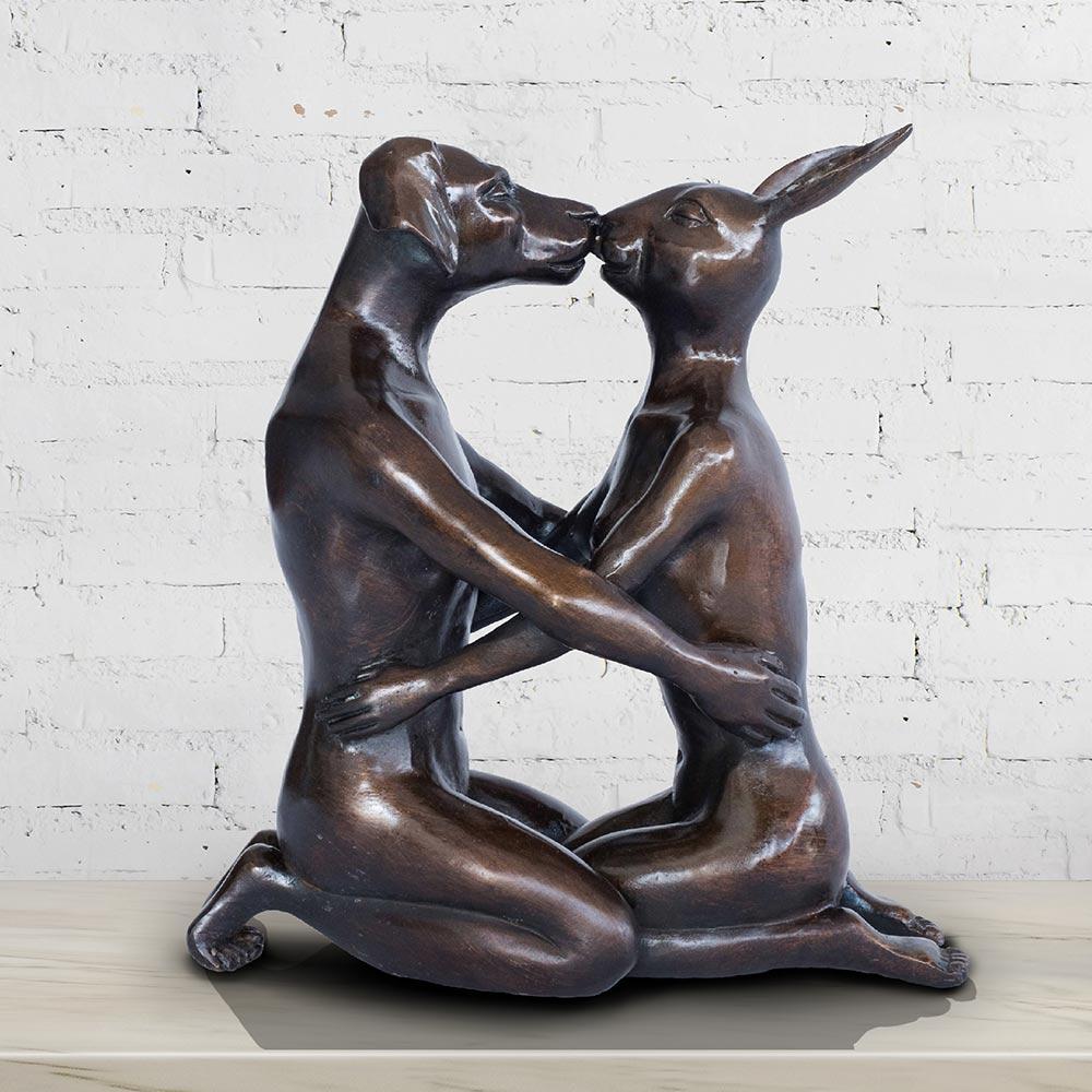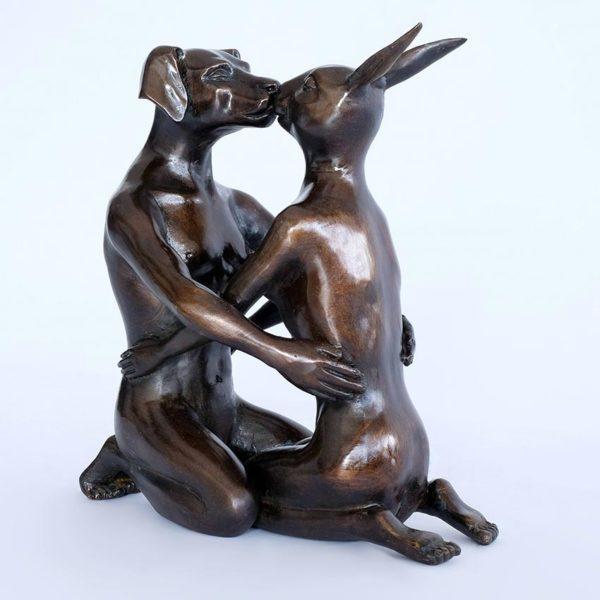 Gillie and Marc believe that you can fall in love with the same person, over and over again. Dogman and Rabbitwoman also like to fall in love over and over. And for them, the best way to do this, is with a kiss. Dogman and Rabbitwoman love to kiss. Over the last five years, they have locked lips in various Gillie and Marc paintings. Now their sweet and tender kiss has been immortalised in bronze for all of us to enjoy.
