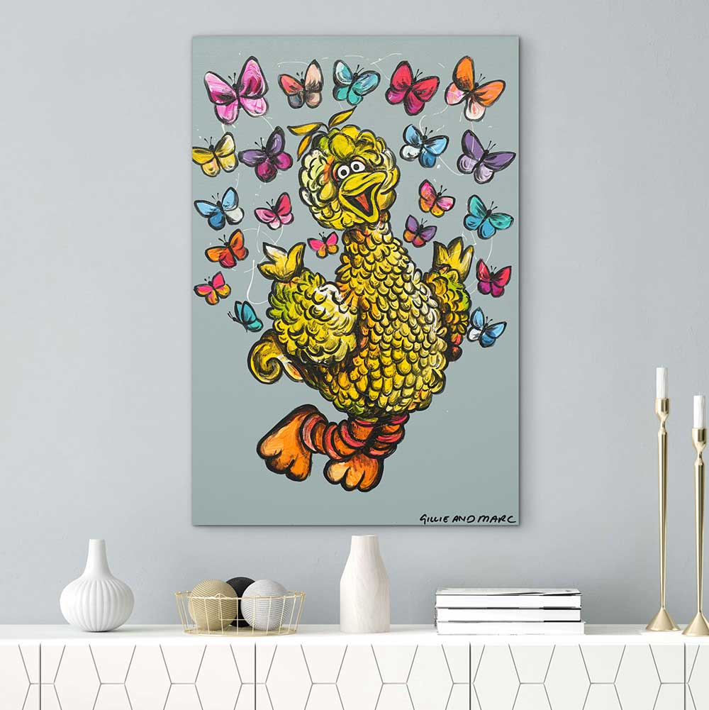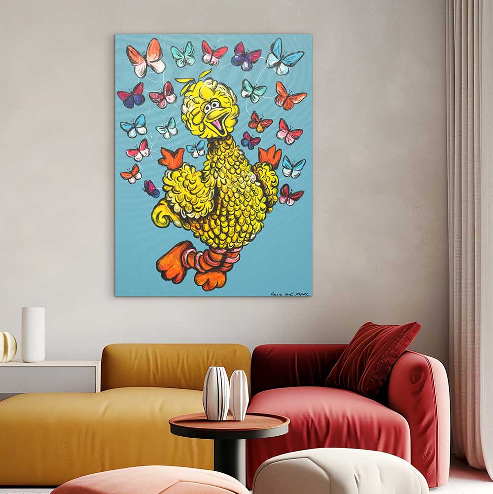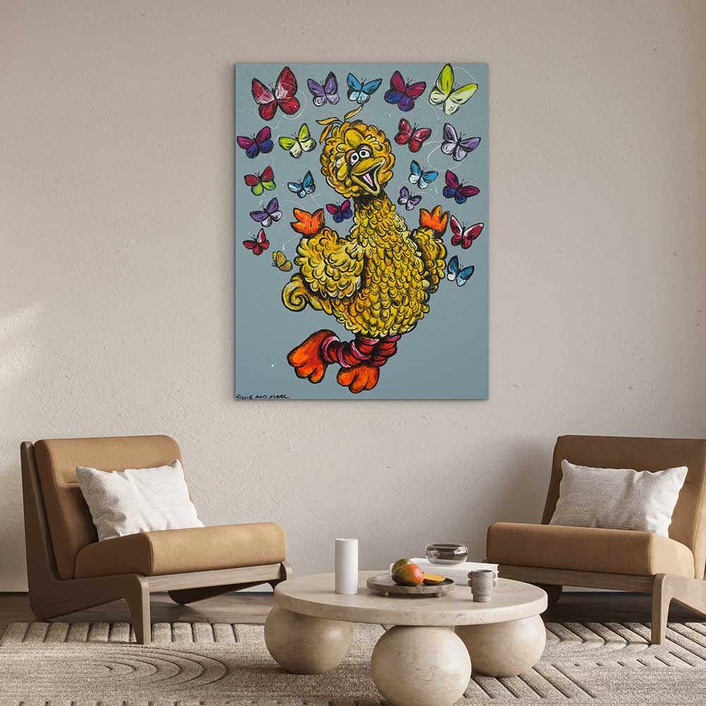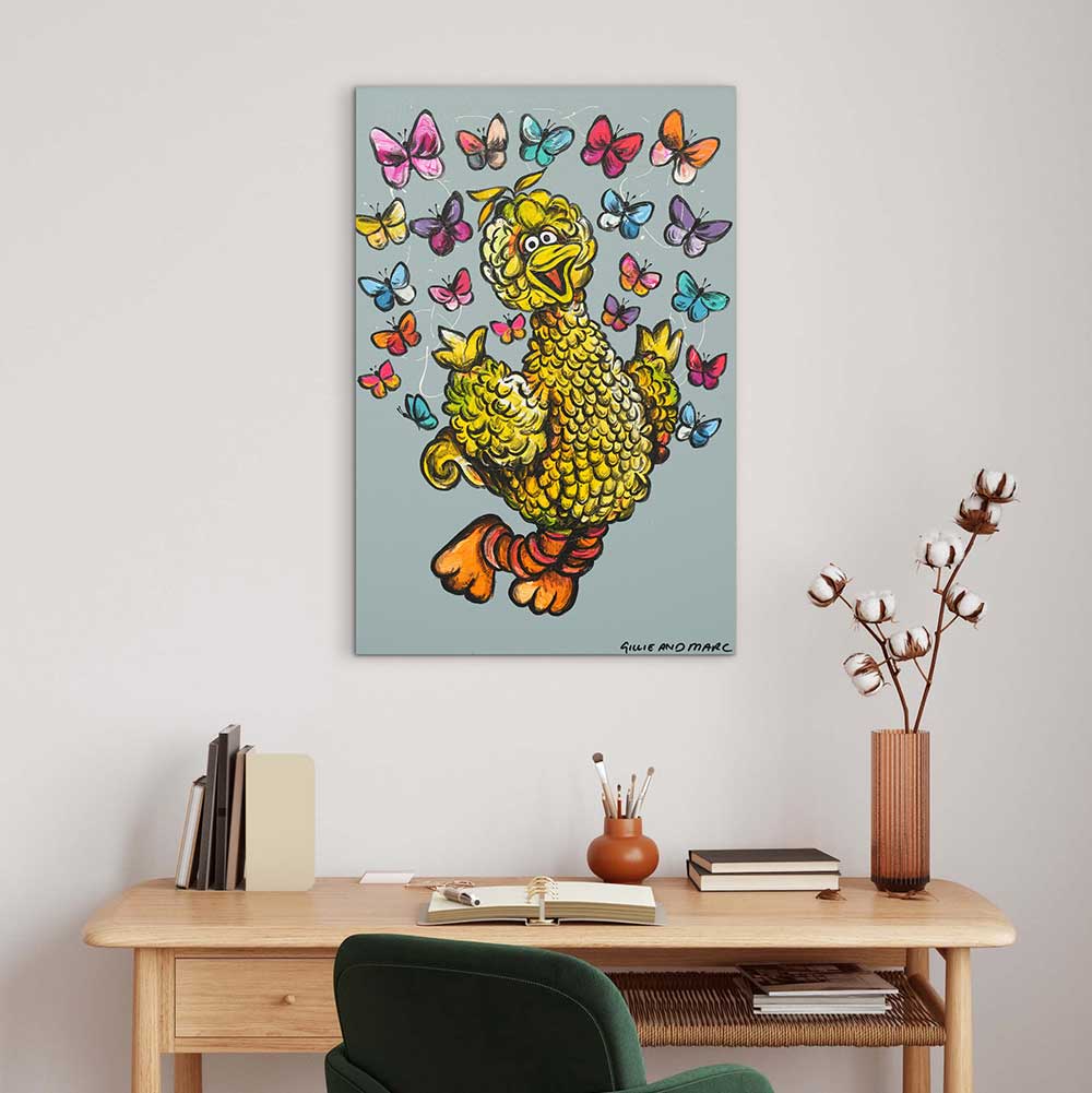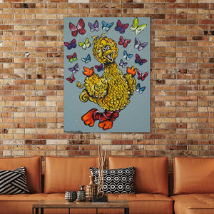 Description This artwork shows a joyful yellow bird floating effortlessly in midair, arms open as colorful butterflies gather around in a gentle, playful orbit. The bird’s wide smile and open posture express unconditional happiness and an embracing spirit, as if welcoming the world exactly as it is. Surrounded by movement and light, the scene celebrates positivity, imagination, and the simple beauty of loving everything without hesitation.