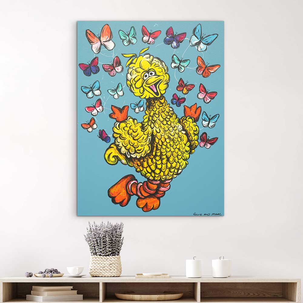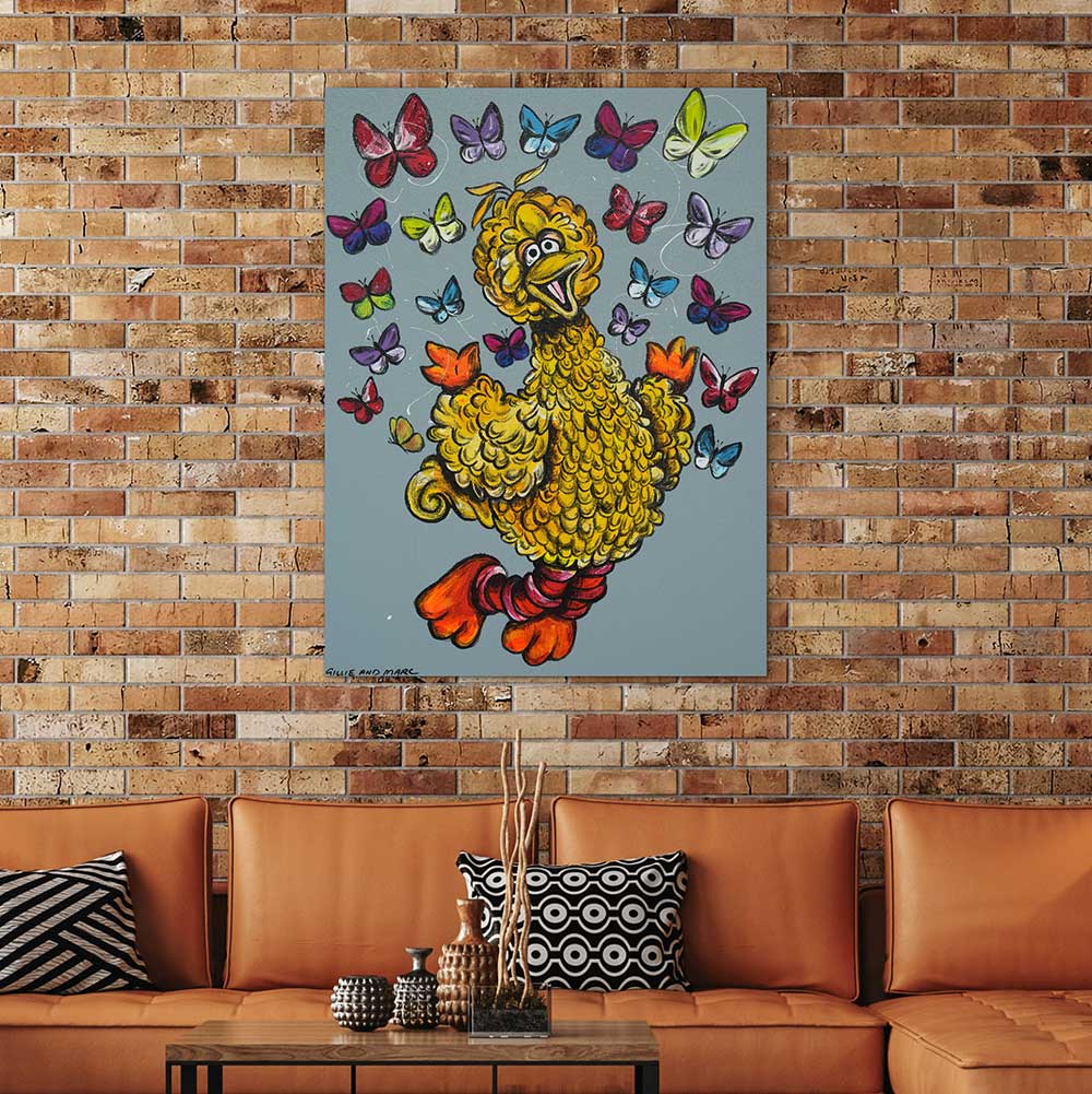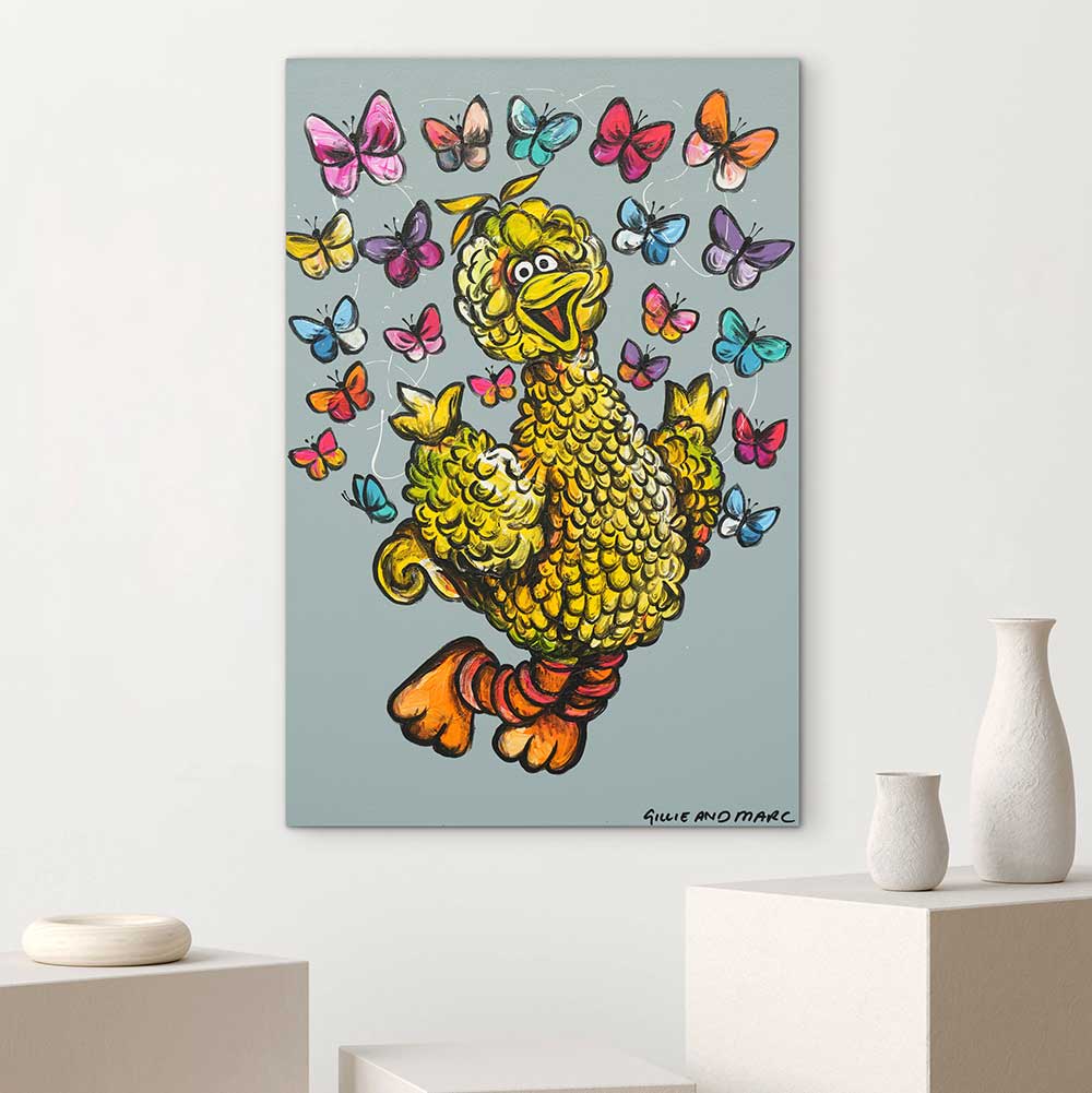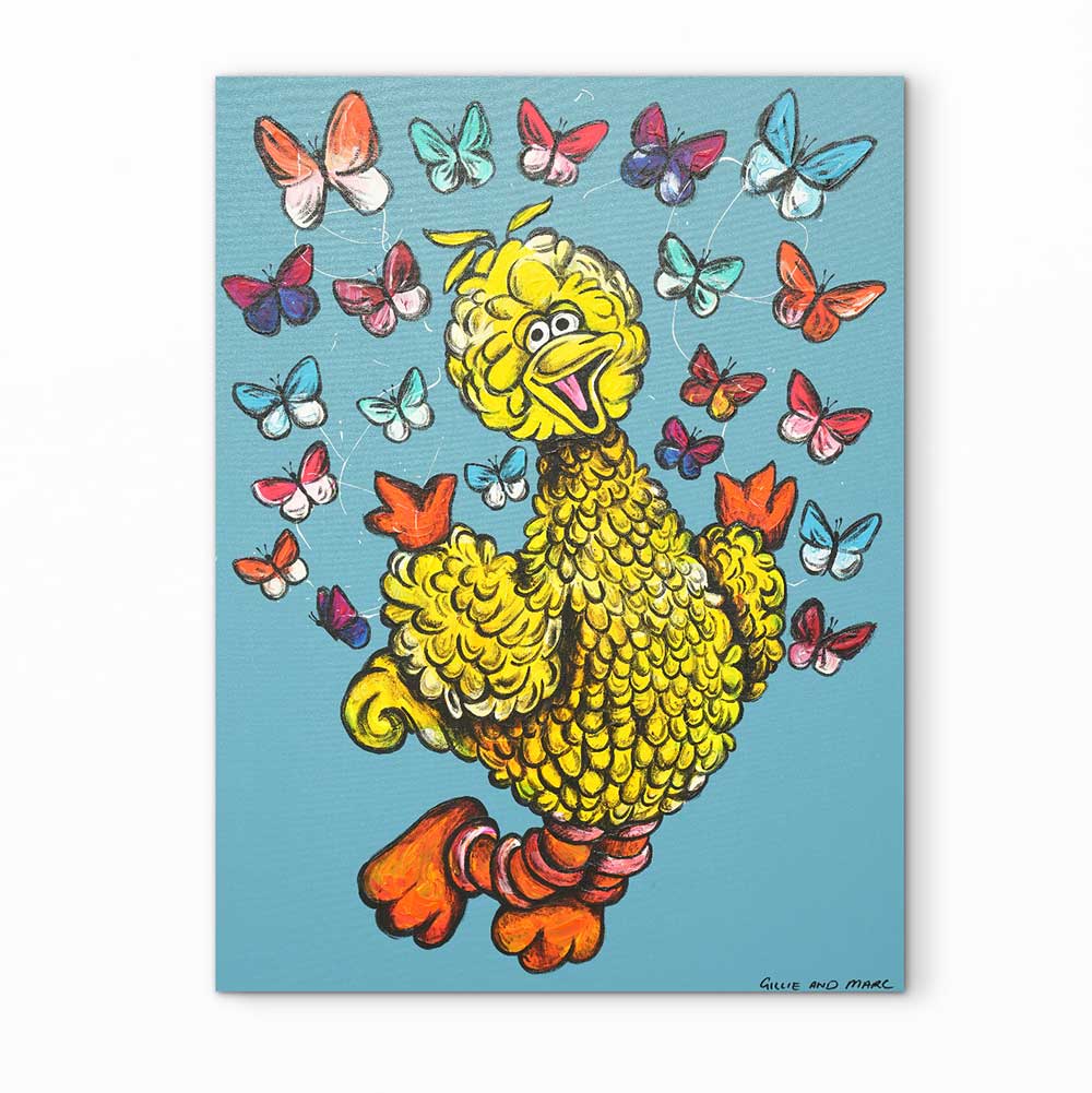 Description This artwork shows a joyful yellow bird floating effortlessly in midair, arms open as colorful butterflies gather around in a gentle, playful orbit. The bird’s wide smile and open posture express unconditional happiness and an embracing spirit, as if welcoming the world exactly as it is. Surrounded by movement and light, the scene celebrates positivity, imagination, and the simple beauty of loving everything without hesitation.